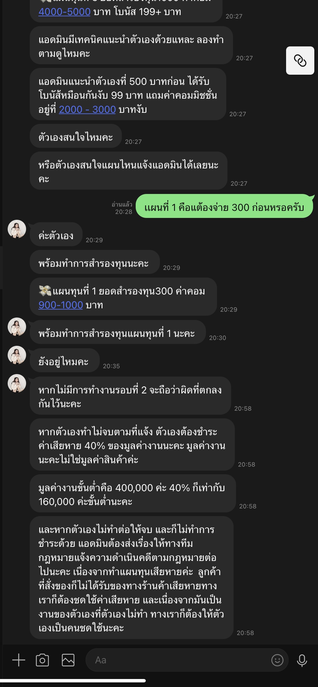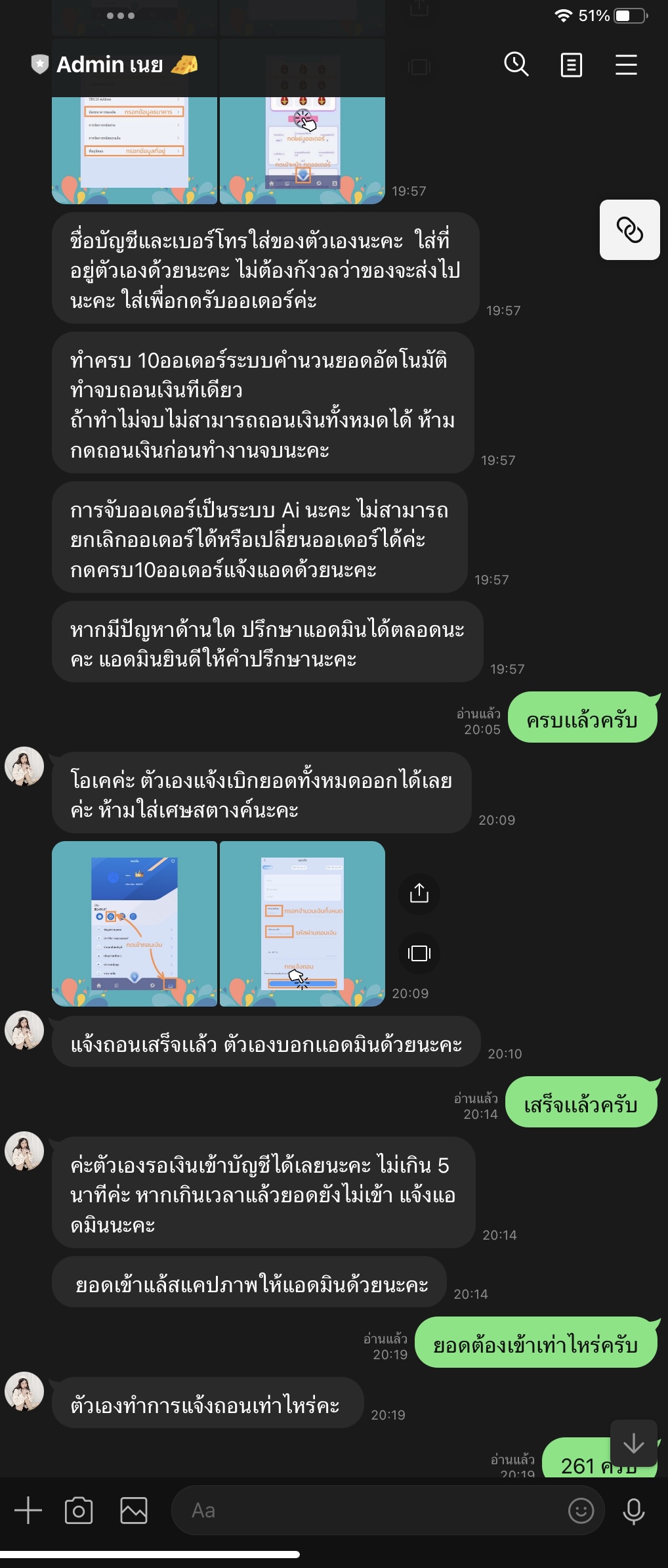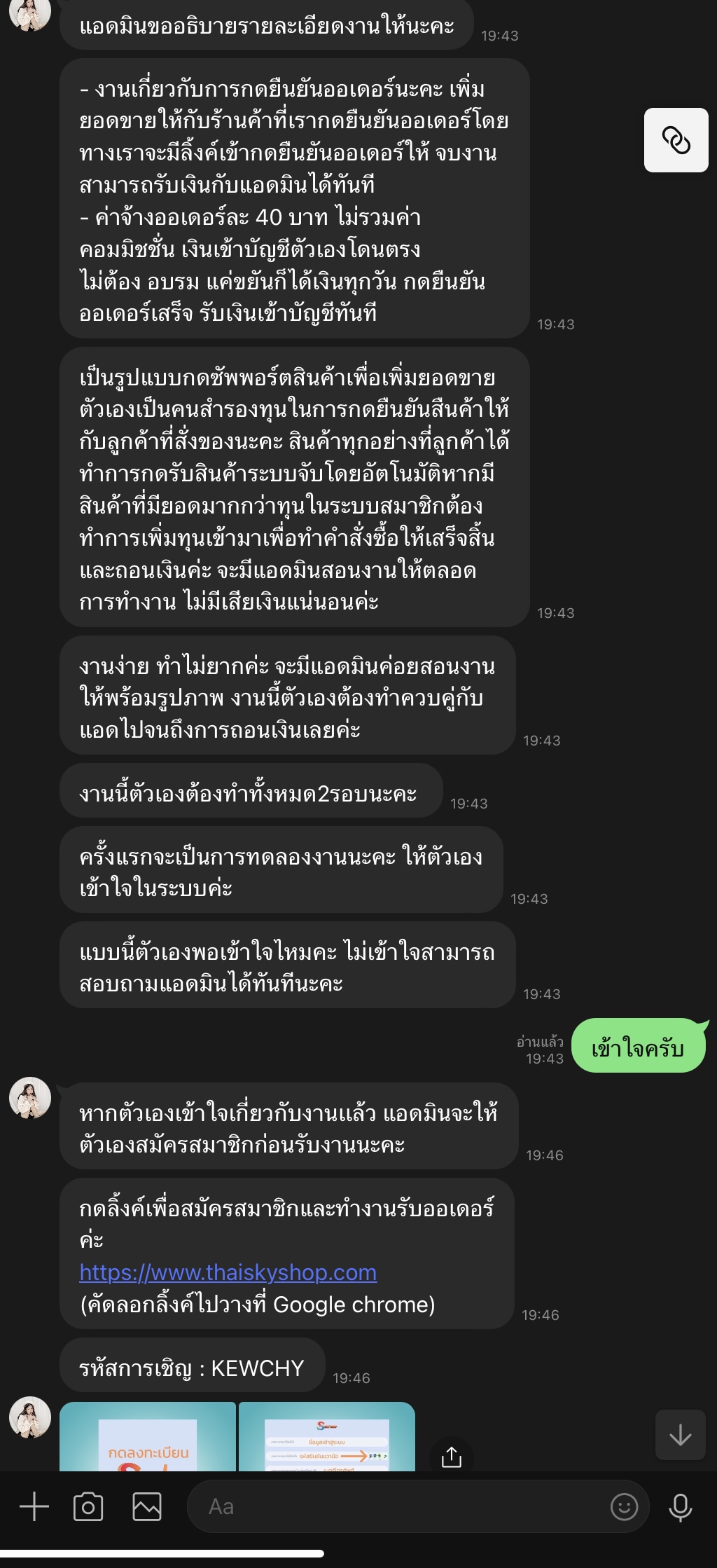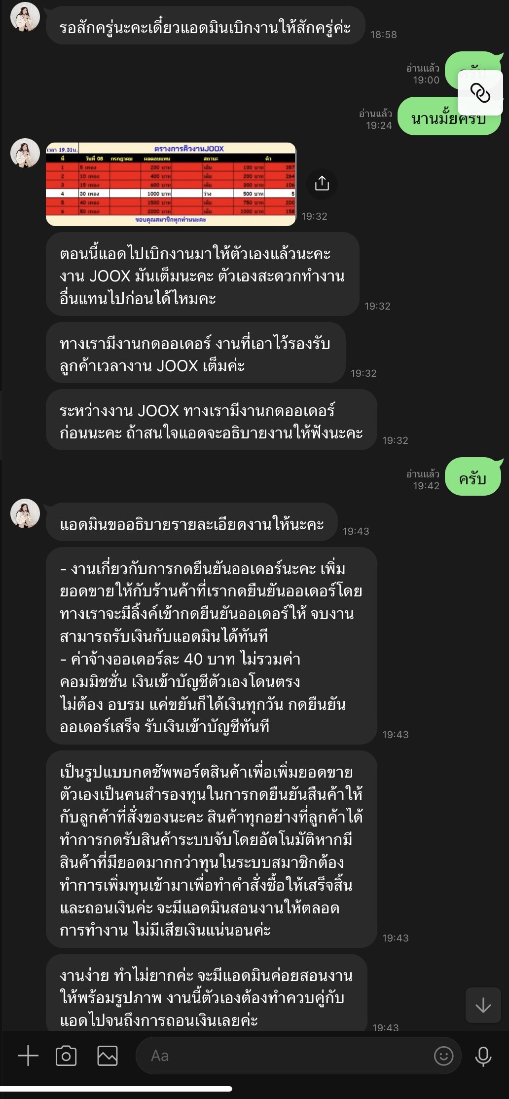 สวัสดีค่ะ คือเราอยู่ในช่วงปิดเทอมแล้วอยากมีรายได้เสริมเราเลยไปเห็นโพสต์นึงในทวิตเตอร์ เราเลยลองแอดไลน์ไปถามเขาก็บอกรายละเอียดต่างๆมาเกี่ยวกับการทำงานนี้ที่เป็นงานกดรับออเดอร์สินค้า เขาเลยให้เราเติมเข้