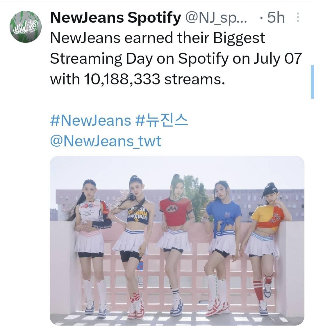 'New Jeans' ของ NewJeans มียอดสตรีมทะลุ 100 ล้านบน Spotify เป็นเพลงที่ 8 ของวงที่ทำสถิตินี้ได้ต่อจาก Attention, Hype Boy, Cookie, Hurt, Ditto, OMG และ Super Shy