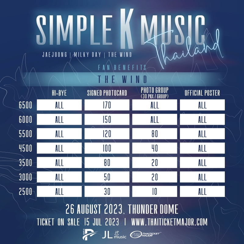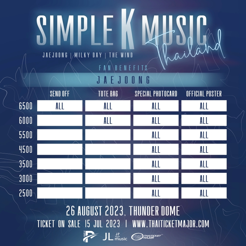ผู้จัด SIMPLE P. Entertaiment ได้ประกาศความพร้อมกับคอนเสิร์ตที่ทุกคนไม่ควรพลาดใน “ SIMPLE K MUSIC Thailand “ งานนี้ที่ ได้คว้านักร้องชั้นนำหนุ่มหล่อระดับเทพเกาหลีที่การันตีเสียงร้องอย่าง "คิม แจ จุง" (KIM JAE JOONG) กับเสียงร้องที่พร้อมสะกดแฟนเพลงทุกครั้ง พร้อมแล้วที่จะกลับมาระเบิดความสนุกในเวทีแห่งนี้ ร่วมด้วย 2 ศิลปินมากความสามารถ และการมาเยือนไทยครั้งแรกของ “มิลกี้ เดย์” (Milky Day) นักร้องอาร์แอนด์บีที่กำลังมาแรงมีเพลงที่เป็นที่รู้จักอย่าง You'll Be Alright, Take It Slow, fool, และ Youuu และอีกหนึ่งศิลปินน้องใหม่ 7 หนุ่มที่กำลังเป็นที่จับตามอง วง The Wind (เดอะวินด์) ซึ่งประกอบไปด้วยชินแจวอน, คิมฮีซู, ชเวฮันบิน, พัคฮายูชาน, อันชานวอน, จางฮยอนจุน และ ธนาธร สมาชิกคนไทยเพียงหนึ่งเดียว ซึ่งจะเป็นโอกาสพิเศษที่ทั้ง 3 ศิลปินจะมาร่วมกันทำให้คอนเสิร์ตที่ประเทศไทยในครั้งนี้เต็มไปด้วยความสุขและความทรงจำอย่างแน่นอน