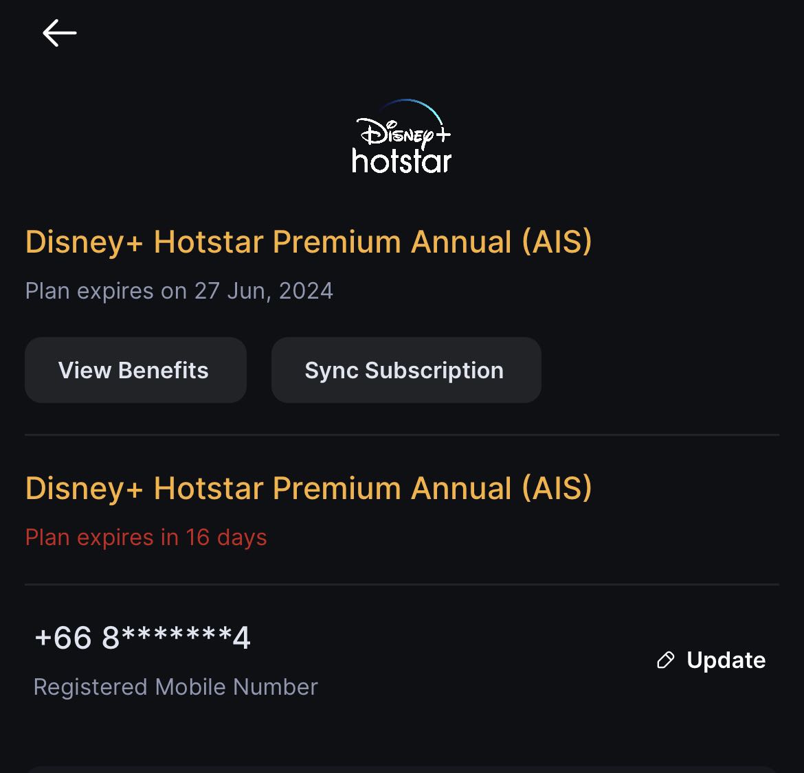 พึ่งต่ออายุรายปี Disney plus hotstar ผ่านบริการของ AIS ไปเมื่อ 30 สิงหาคม 2568 วันนี้ 19 ตุลาคม 2568 มีข้อความแจ้งว่า อีก 4 วัน การเป็นสมาชิกจะหมดอายุ ต้องการทราบว่าทำไมเป็นแบบนั้นค่ะ แล้วที่พึ่งต่ออา