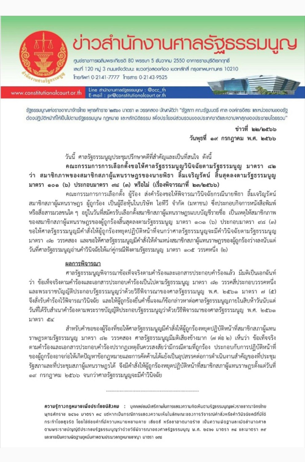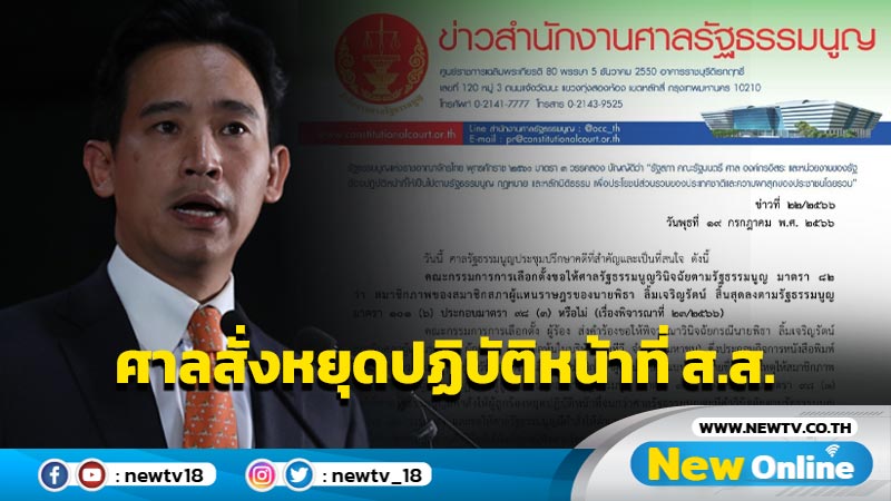 ด่วน! ศาล รธน.รับวินิจฉัยสมาชิกภาพ ส.ส. "พิธา" พร้อมสั่งหยุดปฏิบัติหน้าที่