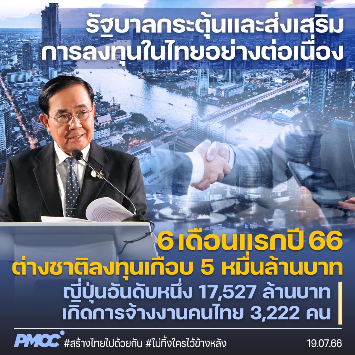 รัฐบาลกระตุ้นส่งเสริมการลงทุนในไทยอย่างต่อเนื่องครึ่งปีแรก 2566 ต่างชาติลงทุนในไทย 48,927 ล้านบาทจ้างงานคนไทย 3,222 คน