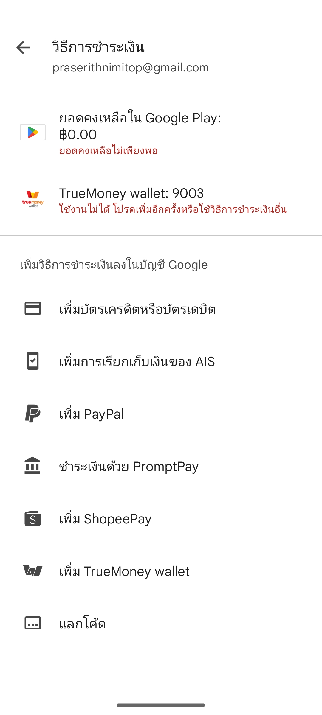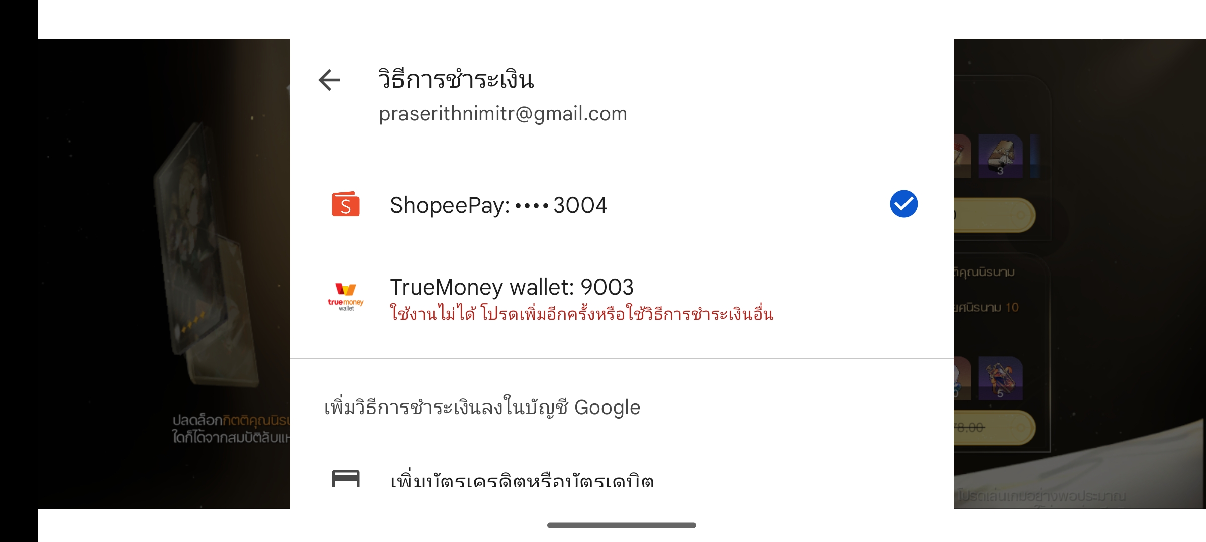 มันขึ้นแบบนี้ค่ะ "ใช้งานไม่ได้ โปรดเพิ่มอีกครั้งหรือใช้วิธีการชาระเงินอื่น"