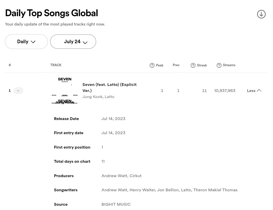 เพลง 'Seven (feat. Latto)' ของ Jung Kook วันนี้มียอดสตรีม 10,937,963 ครั้ง ครองอันดับ #1 บนชาร์ต Spotify Global ได้ 11 วันติด
