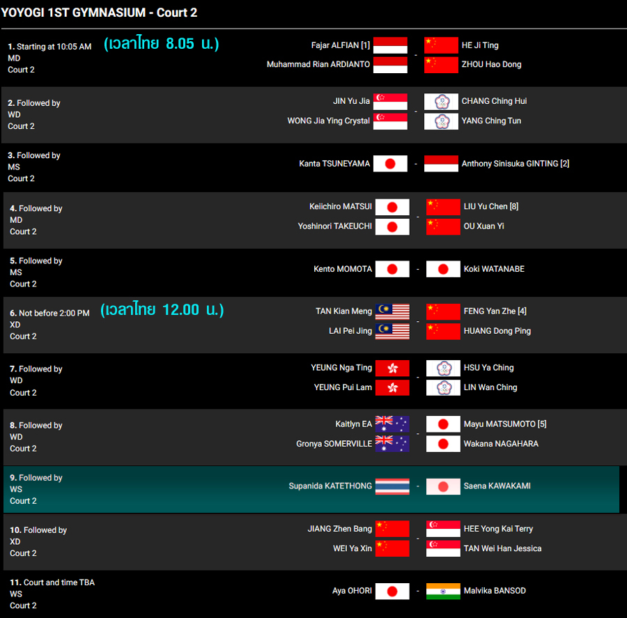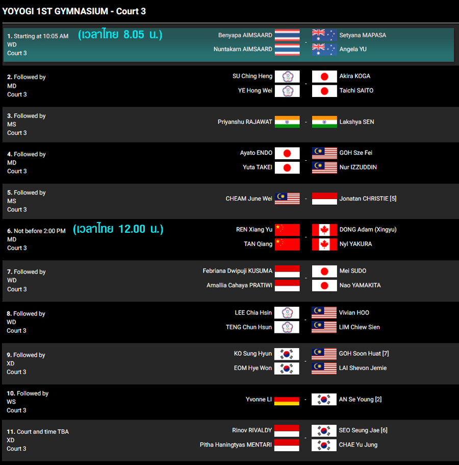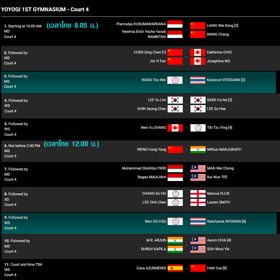 • ถ่ายทอดสด [Court 1 - 4] ทาง Youtube BWF TV (คู่แรกเวลา 8.00 น.)
