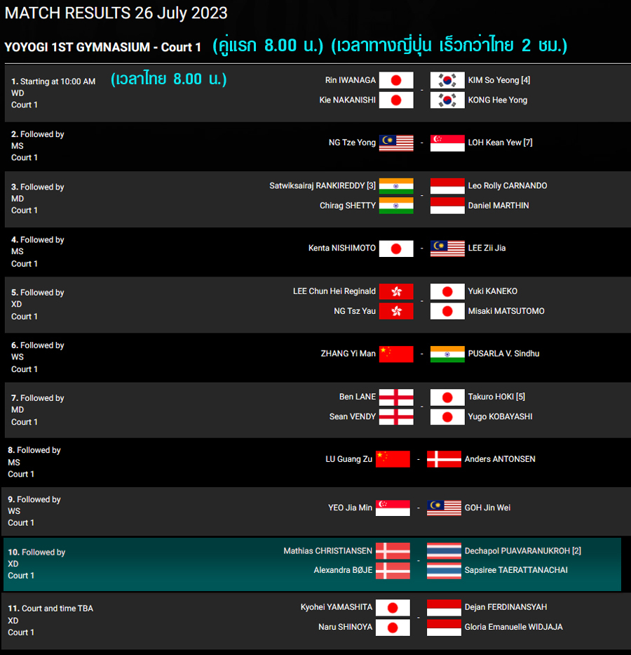 • โปรแกรม/ผลการแข่งขัน : รอบ 32 คน [26 ก.ค. 66] [เวลาทางญี่ปุ่น เร็วกว่าไทย 2 ชม.]