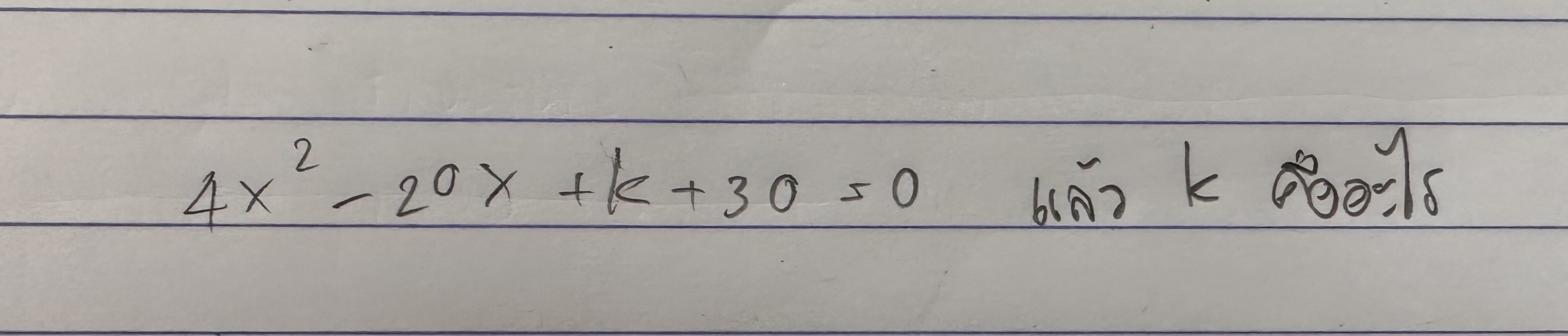 ถ้า 4x กำลัง 2 -20x +k +30 = 0 เมื่อ k เป็นค่าคงตัวมีเพียงคำตอบเดียว แล้วค่าของ k คือเท่าใด ขอวิธีทำกับคำตอบด้วย