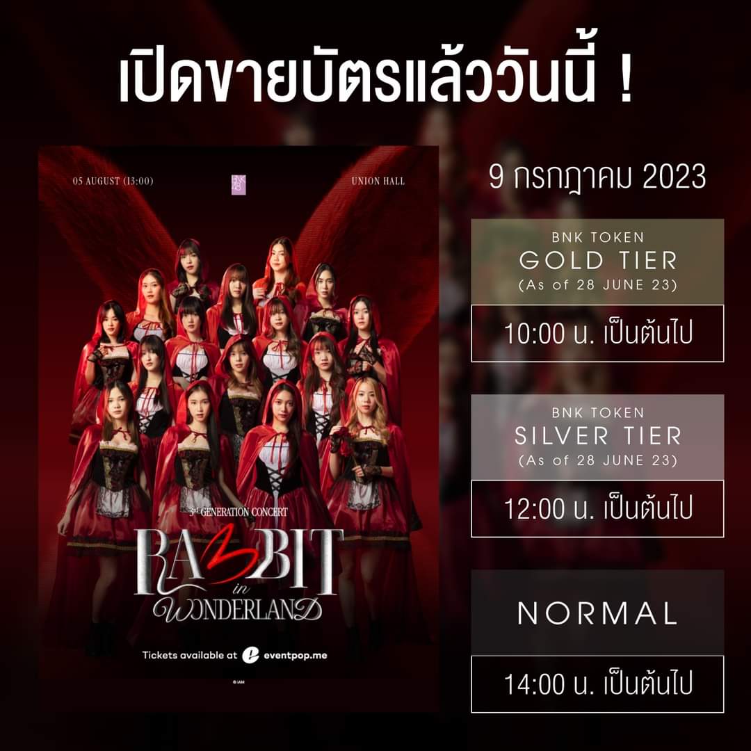 # UPDATE ยอดจองบัตรคอนเสิร์ต BNK & CGM ทั้ง 4 งาน ในเดือนนี้ ข้อมูล ณ วันที่ 2\8\68 งานแรก คอนรุ่น 3 Rabbit in Borderland The Musical ใกล้เต็มแล้ว เหลือโซน B,C อีกนิดหน่อย คอนส่งท้าย ป๊