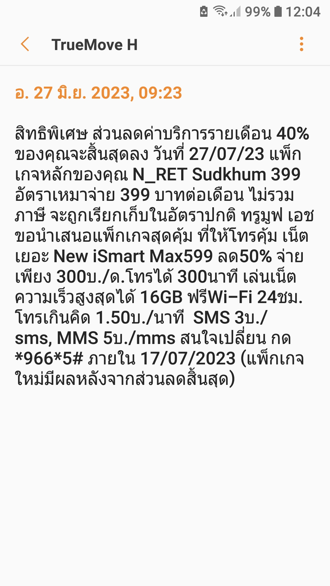 True ส่ง sms New ismart max 599 ลด 50% เหมาจ่ายเดือนละ 300 หมดเดือนหน้า