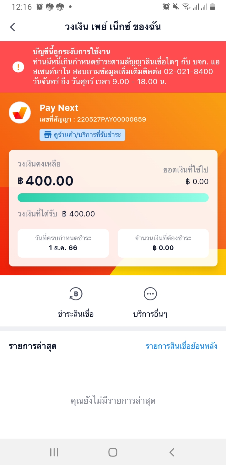ชำระเงิน pay next ครบแล้ว แต่ขึ้นระงับใช้งานอยู่ จะต้องทำยังไงคะ สอบถามเจ้าหน้าที่บอกว่าจ่ายล่าช้าไป1งวด ในรอบ6เดือน ไม่สามารถบอกได้ว่าจะใช้งานได้เมื่อไร ต้องรอประชาสัมพันธ์จากทางบริษัท จะต้องทำยังไงถ