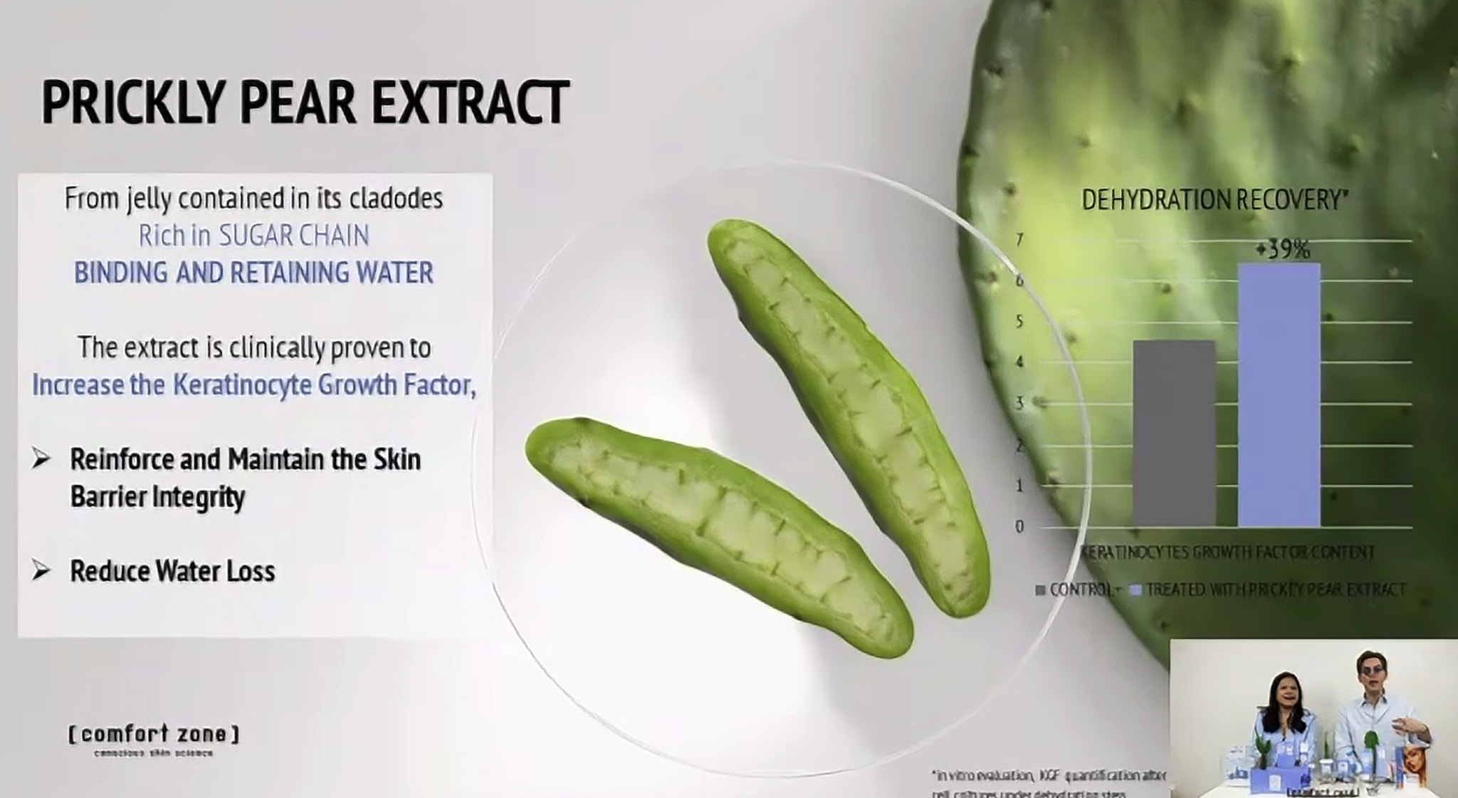 ส่วนผสมชูโรงด้วย Prickly Pear ที่เป็นสารสกัดจากกระบองเพชร ที่ช่วยกระตุ้น KGF ทำให้เกราะป้องกันผิวแข็งแรง ชุ่มชื้น ทำให้การเสียน้ำใต้ผิวลดลง
