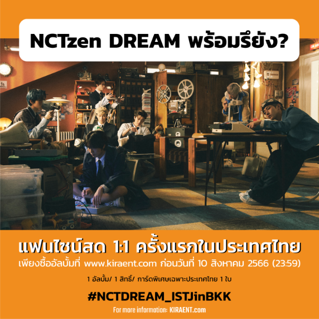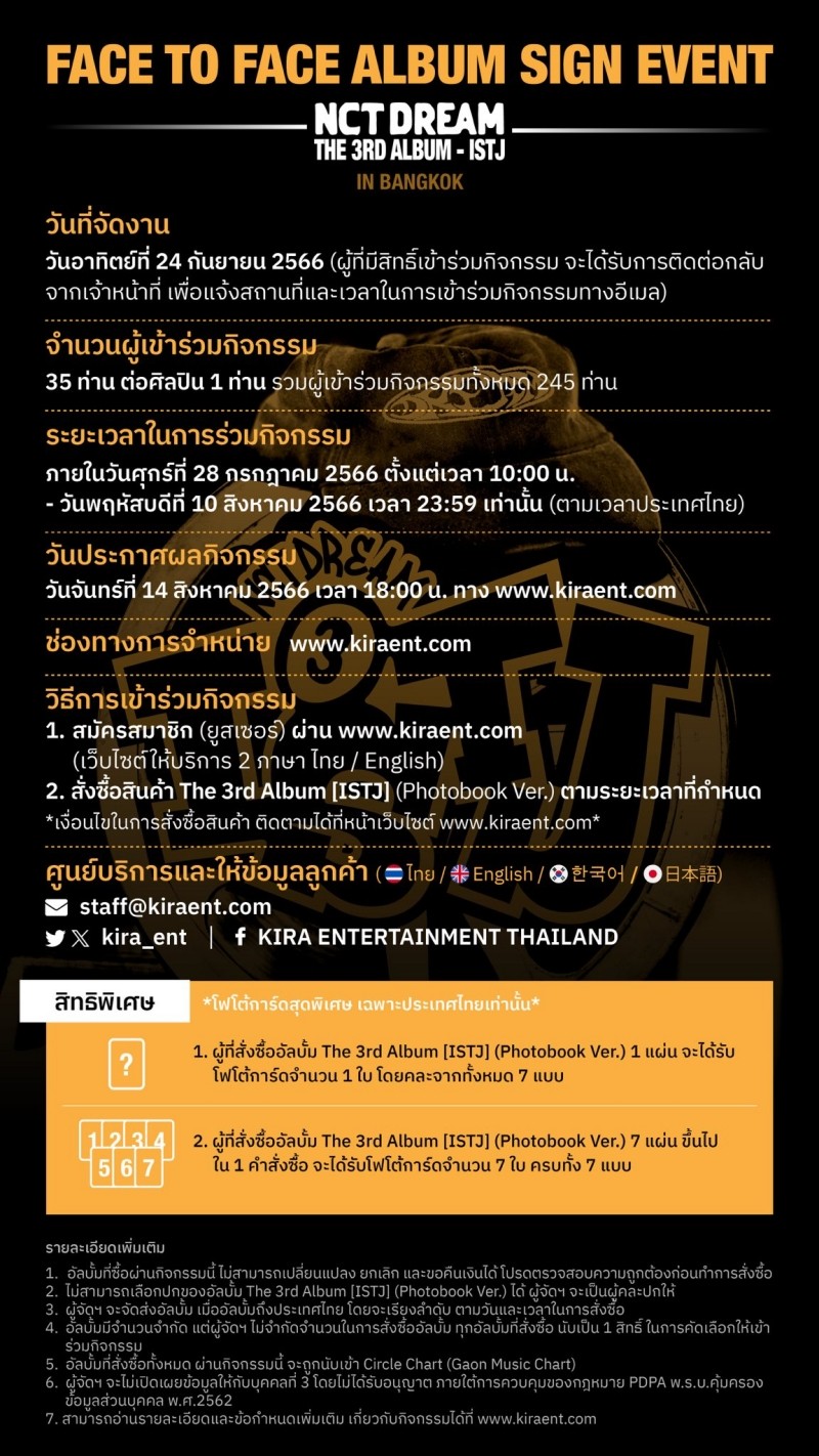 ดรีมเซ่นชาวไทยเตรียมเฮ เพราะ NCT DREAM ตัวจริงเสียงจริง จะมาพบกับแฟนๆ ที่มีสิทธิ์เข้าร่วมงาน ในวันอาทิตย์ที่ 24 กันยายน 2566 นี้ กติกาในการเข้าร่วมงาน เพียงซื้ออัลบั้มเต็มชุดที่ 3 “ISTJ”ผ่าน www.kiraent.com โดยทุกๆ การซื้ออัลบั้ม 1 แผ่น = 1 สิทธิ์ในการเข้าร่วมไซน์สด 1:1 กับศิลปินวง NCT DREAM ที่คุณเลือก ไม่ว่าจะเป็น MARK, RENJUN, JENO, HAECHAN, JAEMIN, CHENLE, JISUNG โดยอัลบั้มมีจำนวนจำกัด *ยิ่งซื้อมากยิ่งมีสิทธิ์มาก*