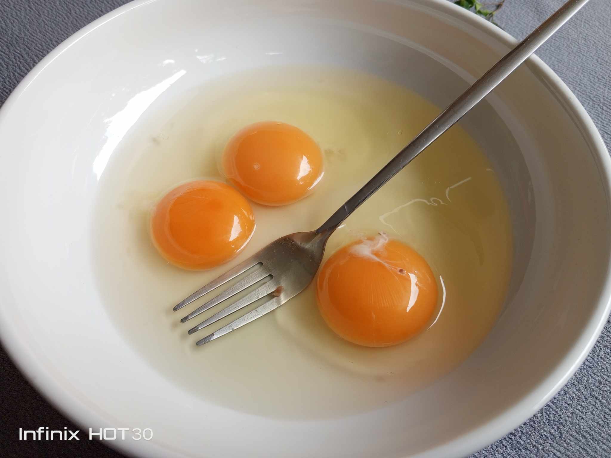 ตอกไข่ใส่ถ้วย แล้วตีไข่ให้เข้ากัน