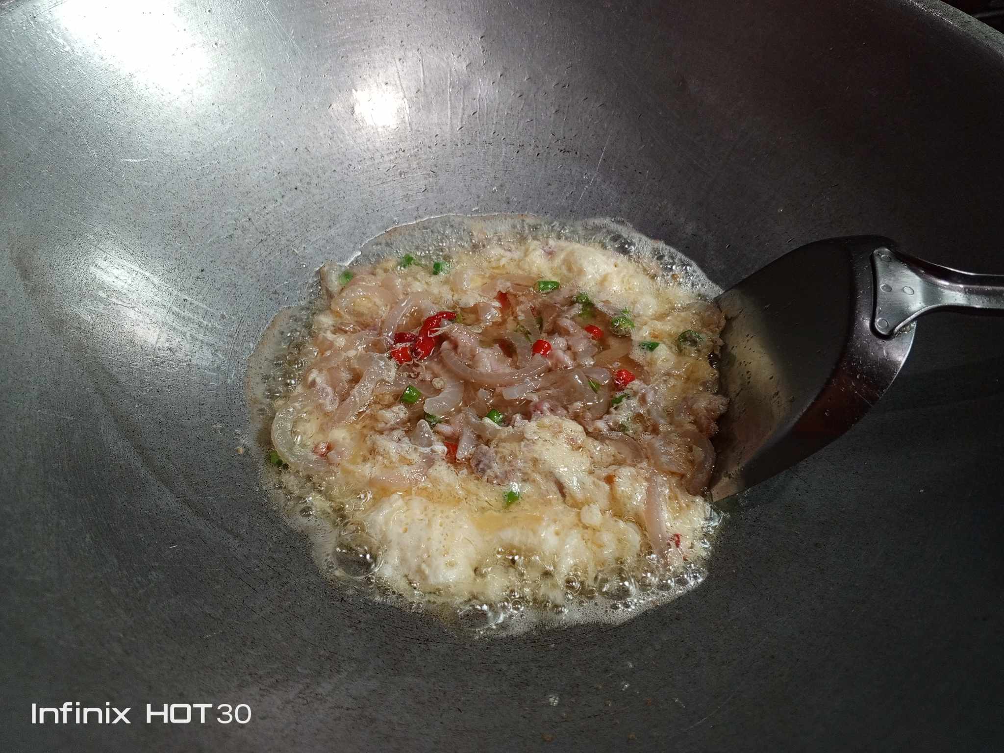 ทีนี้ก็ทอดปกติได้แล้วค่ะ รอจนไข่เจียวแหนมของเราสุกดี ก็ตักขึ้นสะเด็ดน้ำมันได้เลย