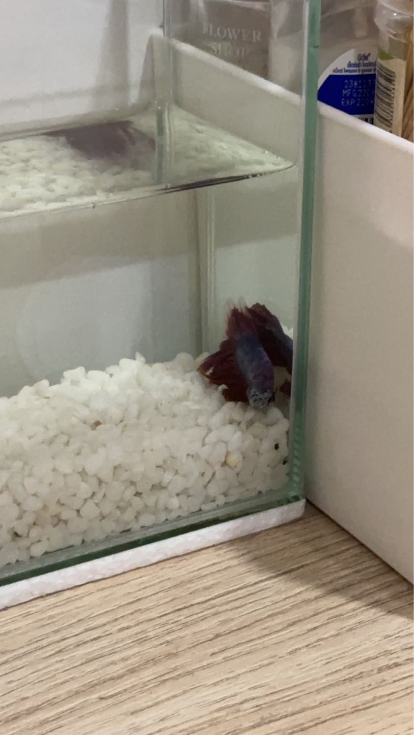 ปลากัดน่าจะเป็นฮาฟมูนตัวผู้ ได้มาใหม่ๆน้ำพักแล้ว4-5วันตอนแกะออกจากกล่องก็ไม่ได้ใส่ทันทีแรับสภาพน้ำก่อนปกติแต่ทำไมตอนเอาน้องลงน้องเป็นแบบนั้นครับ สอบถามผู้รู้ครับ