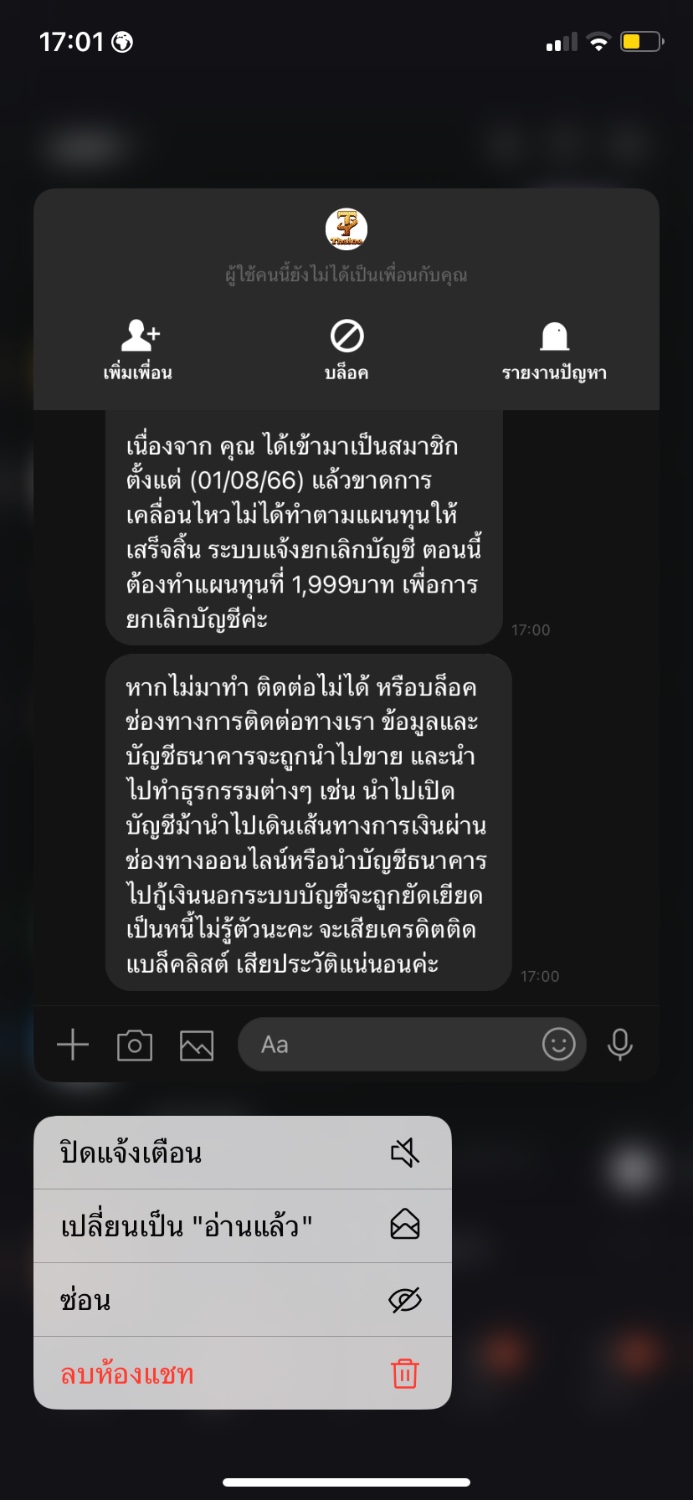 คือเรื่องมันมีอยู่ว่า ที่เราเคยตั่งกระทู้ว่าโดนชวนลงทุนเทรดจากมิจฉาชีพ แล้วพอเรารู้ตัวว่าโดนหลอก เราก็ได้อายัดบัญชีที่เราได้ทำการโอนเงินไปแล้ว หนึ่งในบัญชีนั้นได้มีการติดต่อมา บัญชีที่โอนให้เป็นของทูร