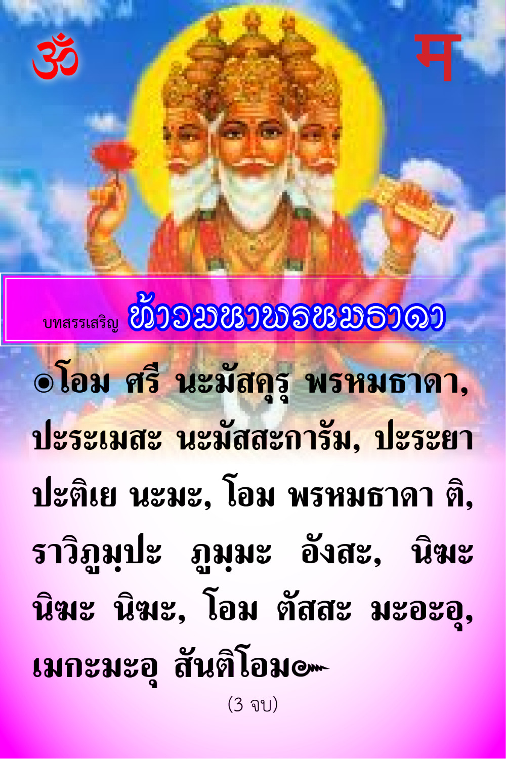 ïโอม ศรี นะมัสคุรุ พรหมธาดา, ปะระเมสะ นะมัสสะการัม, ปะระยา ปะติเย นะมะ, โอม พรหมธาดา ติ, ราวิภูมฺปะ ภูมฺมะ อังสะ, นิฆะ นิฆะ นิฆะ, โอม ตัสสะ มะอะอุ, เมกะมะอุ สันติโอม๛
