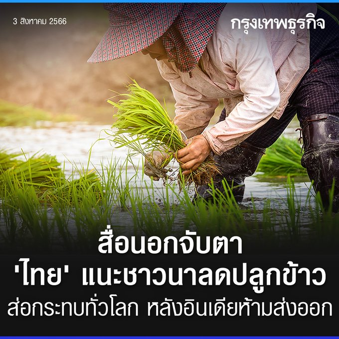 สื่อนอกรายงาน ไทยซึ่งเป็นผู้ส่งออกข้าวรายใหญ่อันดับสองของโลก ขอให้เกษตรกรปลูกข้าวน้อยลงเพื่อประหยัดน้ำ ความเคลื่อนไหวนี้อาจเขย่าตลาดข้าวได้อีกหลังอินเดียห้ามส่งออก