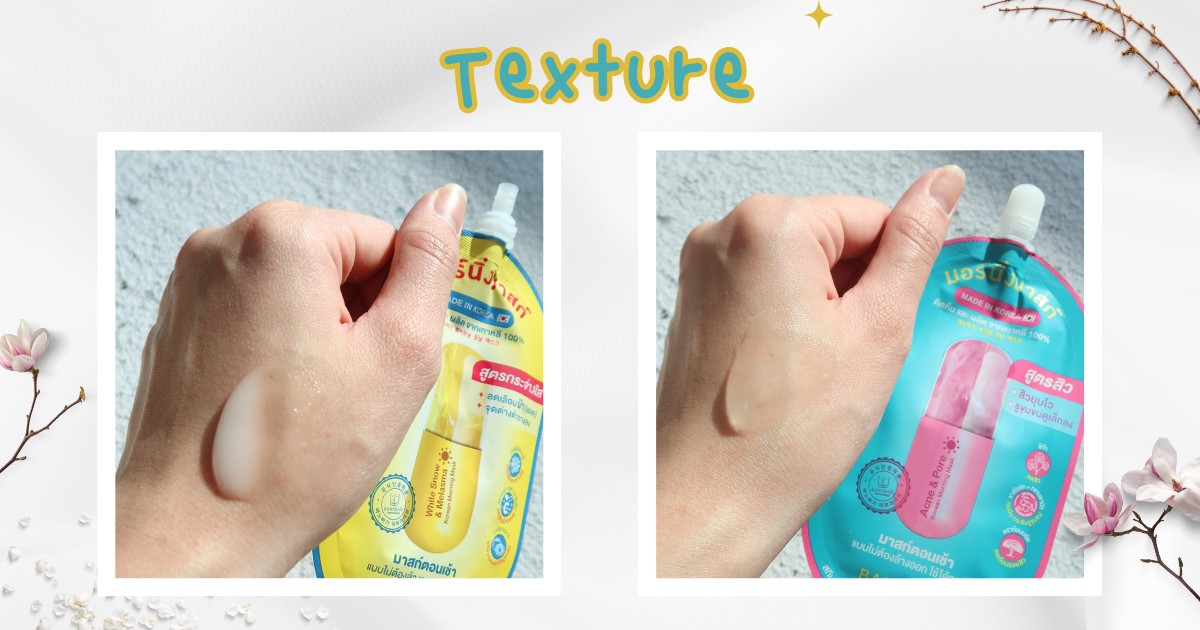 ในส่วนของเนื้อมาสก์ทั้งสองสูตร สูตรกระจ่างใสเนื้อจะเป็นสีขาวขุ่น ส่วน สูตรสิว เนื้อจะเป็นสีใส และไม่ต้องกังวลเรื่องความเหนอะหนะเลยค่ะ