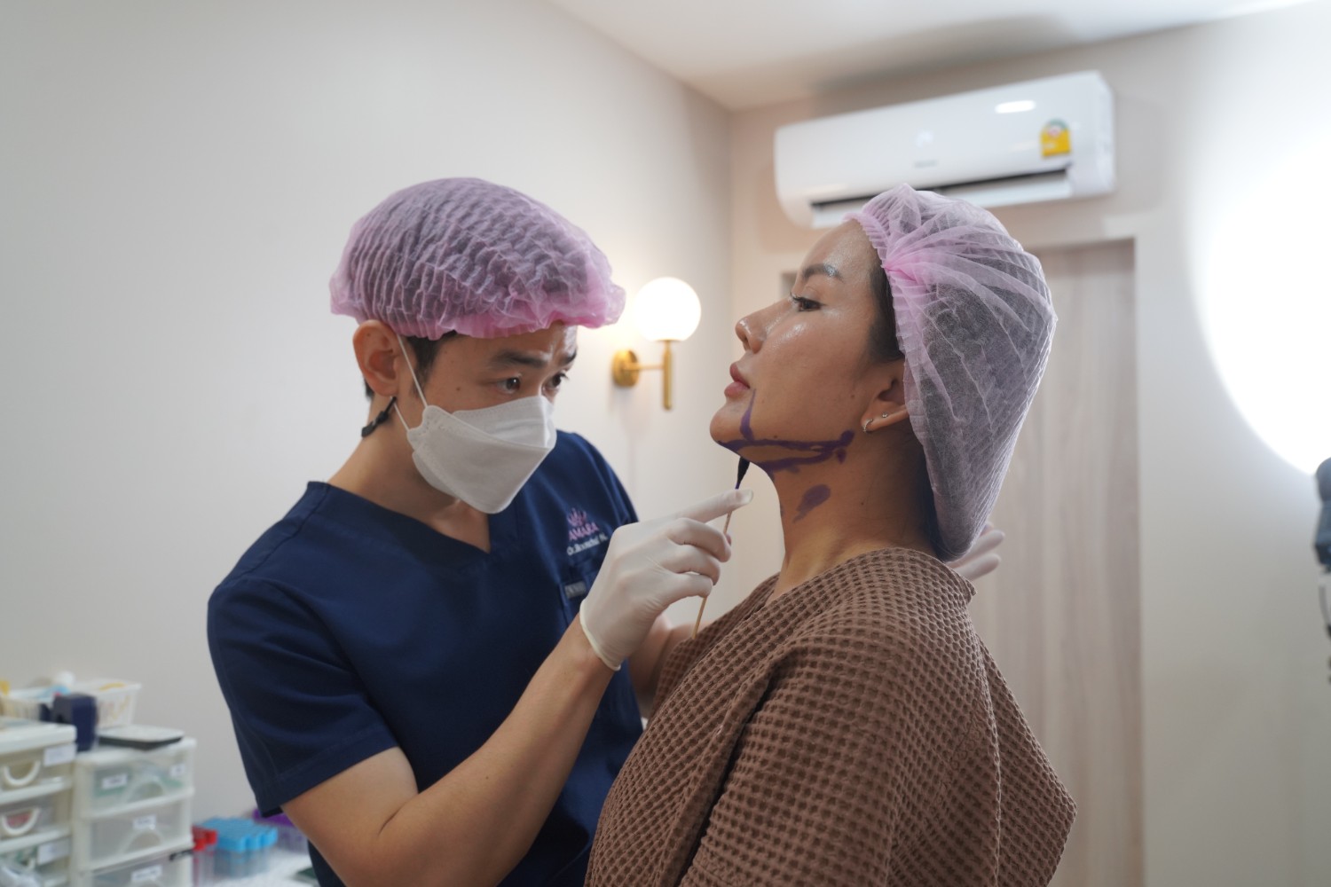 ในขั้นตอนปรึกษาพูดคุย คุณหมอก็เริ่มวาดเพื่อมาร์คจุดที่จะผ่าตัดและดูดไขมันออก วาดไปก็พูดคุยกันไปว่าถ้าผ่าตัดเหนียงหรือดูดไขมันเหนียงอย่างงี้จะเป็นแบบไหน ทำตรงไหนได้ไม่ได้ ถ้าทำจะอันตรายไหมยังไง บอกเลยว่าถึงจะเคยมาดูดไขมันกับคุณหมอท่านเดิม ก็ยังรู้สึกเขินเวลาวาดเคส 😆 หมอก็ถามไถ่ตามปกติ ได้งดอาหารที่บอกไปใช่ไหม นอนพอหรือเปล่า ซึ่งก็ทำตามคำแนะนำมาแบบเป๊ะ ๆ แล้ว แต่คุณหมอก็ยังถามอยู่ดีเพื่อความชัวร์ ใส่ใจมากกก