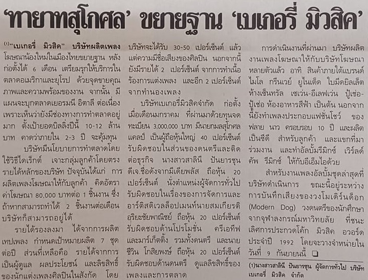 เผยจุดเริ่มต้นอดีตค่ายเพลงดัง "เบเกอรี่มิวสิก" จากหน้าหนังสือพิมพ์
