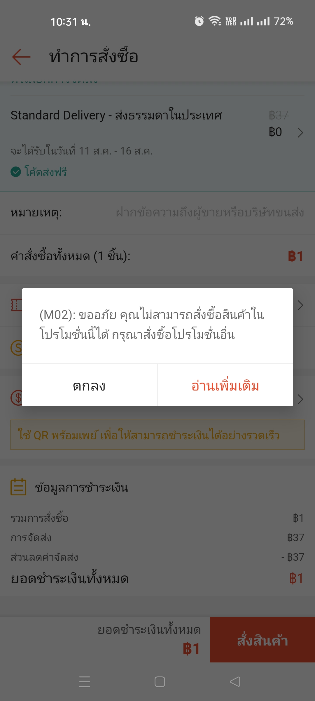 ซื้อของแอปส้มไม่ได้ ขึ้นว่า “คุณซื้อสินค้านี้ถึงจำนวนที่จำกัดแล้ว” แก้ยังไงคะ??