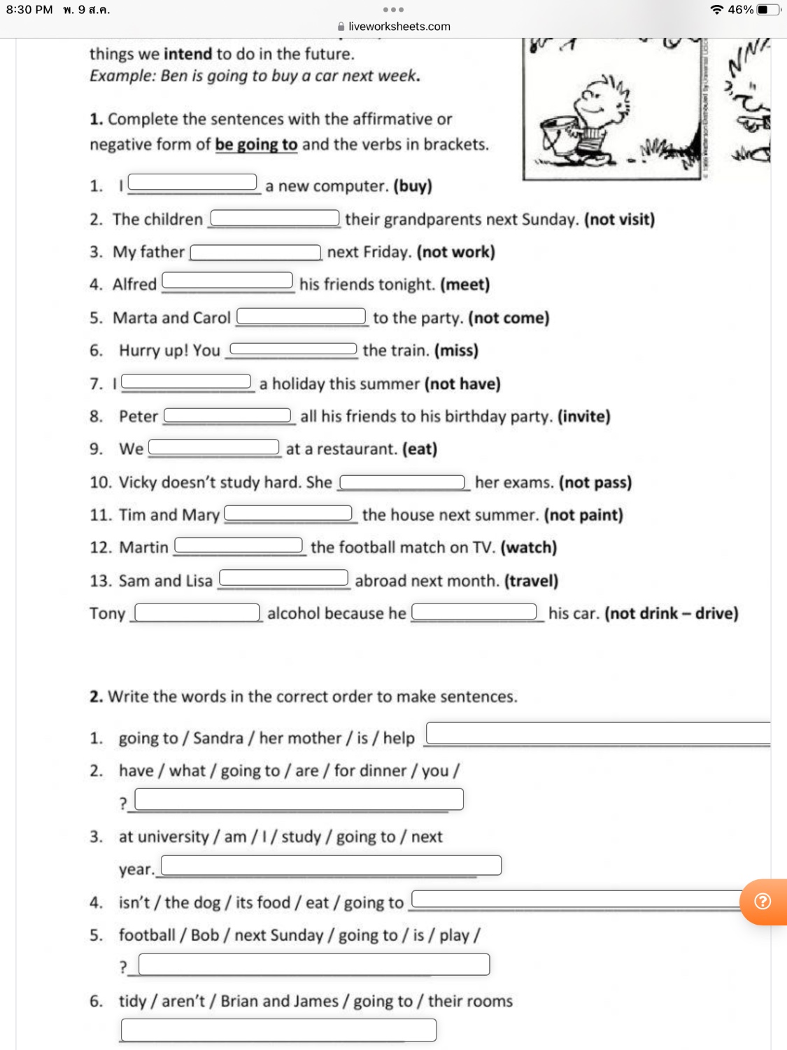 1. Complete the sentences with the affirmative or negative form of be going to and the verbs in brackets.