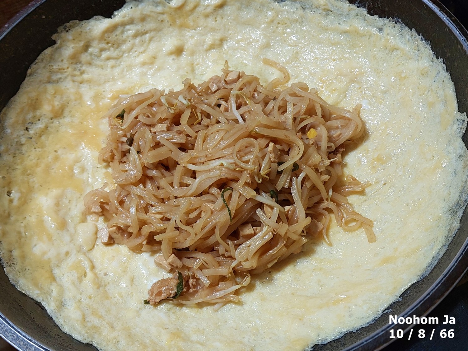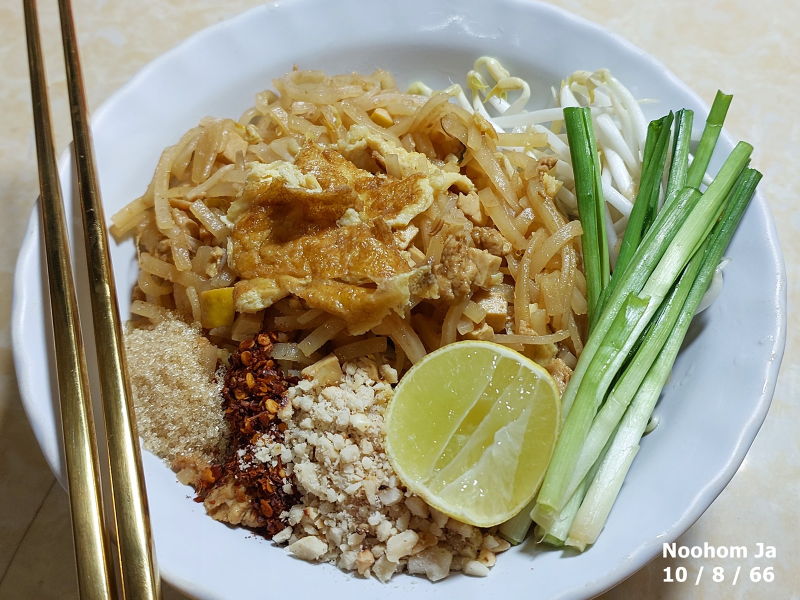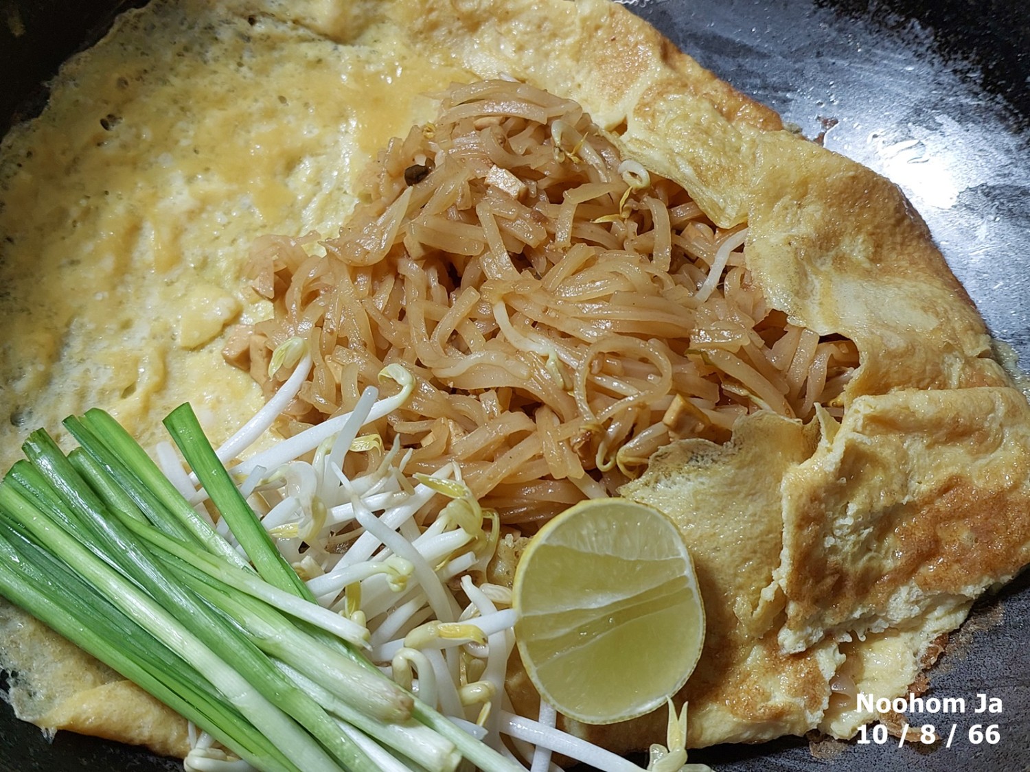 ผัดไทยไข่ห่อ มากินเส้นเล็กอีกแล้วฮะ ผัดไทยห่อไข่ จานนี้ 45 บาท ถ้าไม่ห่อ 40 แต่อยากกินไข่ตู้ม ๆ จ่ายเพิ่ม 5 บาท กินตอนร้อน ๆ คือดีเลย มีใบกุยช่าย ถั่วงอก และมะนาวมาให้ด้วย ครบเครื่องผัด