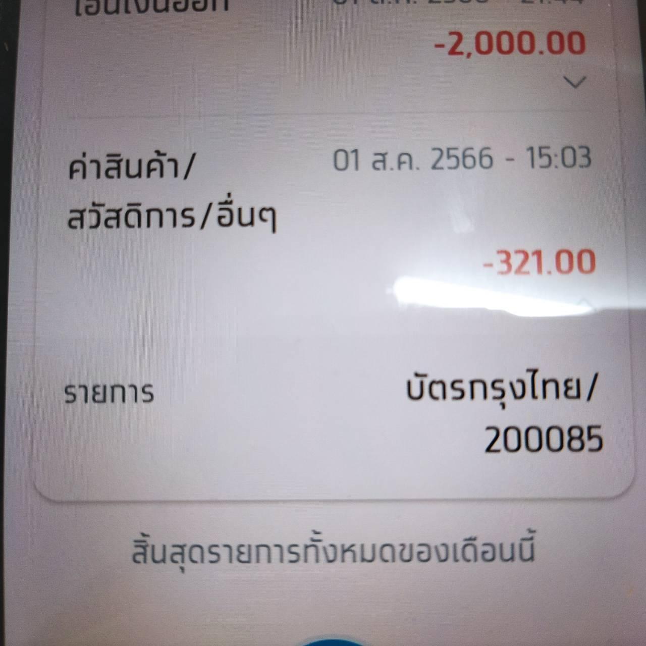 วันที่ 1 สค. กับ 10 สค. อยู่ๆเงินออก ยอด 321 ขึ้นว่าบัตรกรุงไทย แต่บัญชีนี้ไม่มีบัตรมานานมากแล้ว
