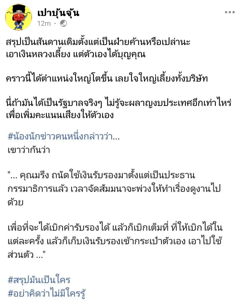ก็นักข่าววงในเค้าแอบกระซิบมาว่านี่ไม่ใช่ครั้งแรก เคยทำมาแล้วตอนเป็นฝ่ายค้านในตำแหน่งอื่น เบิกมาเยอะ ๆ จะได้เหลือเยอะ ๆ แล้วเงินที่เหลือไปไหนต่อก็เป็นอันรู้กัน ข้อมูลนี้เจ้าตัวไม่เคยเปิดเผยเลย แต่คนที่รู้เค้าฝากแฉมา ส่วนประเด็นล่าสุดที่เลี้ยงหมูทะก็แค่ต้องการเบี่ยงประเด็นเรื่องเป็นเด็กเชียร์เบียร์ จุดประสงค์มีเท่านั้นเองจริง ๆ