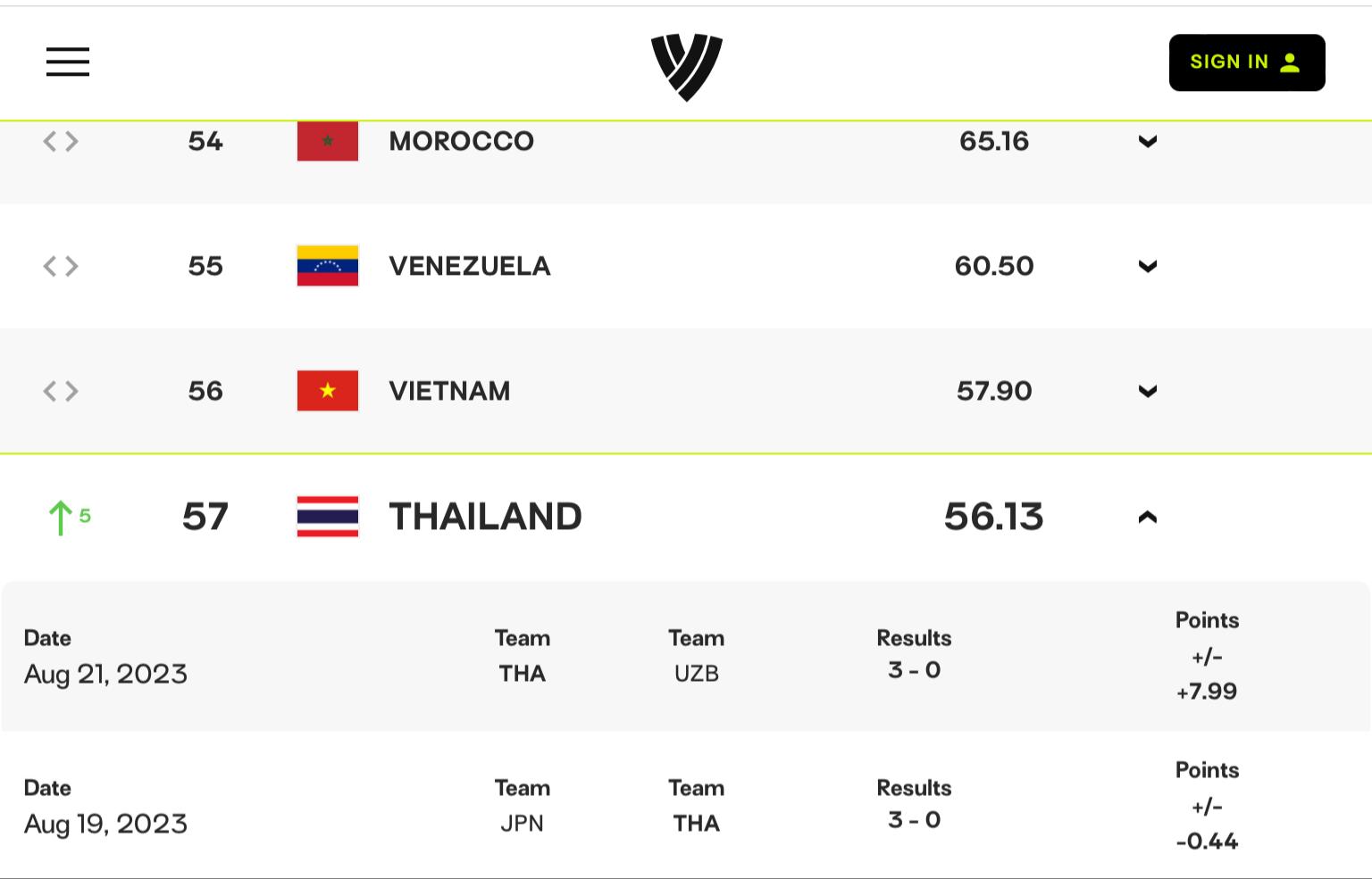ไทยชนะอุซเบกิสถานได้คะแนน +7.99 อันดับโลกพู่งมาอยู่อันดับที่ 57