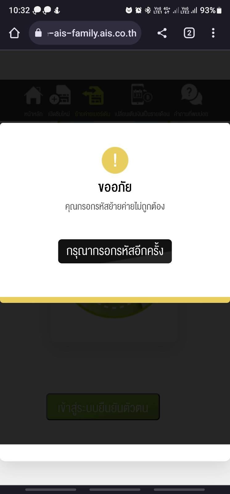 จะย้ายค่ายเบอร์เดิมไป Ais ทำผ่านระบบหน้าเวป แต่ตอนกรอก pin ย้ายค่ายกรอกถูกแล้วแต่ระบบบอกว่ารหัสย้ายค่ายไม่ถูกต้องเป็นเพราะอะไรครับ กรอกทวนสามสี่รอบแล้วเลขก็ถูก