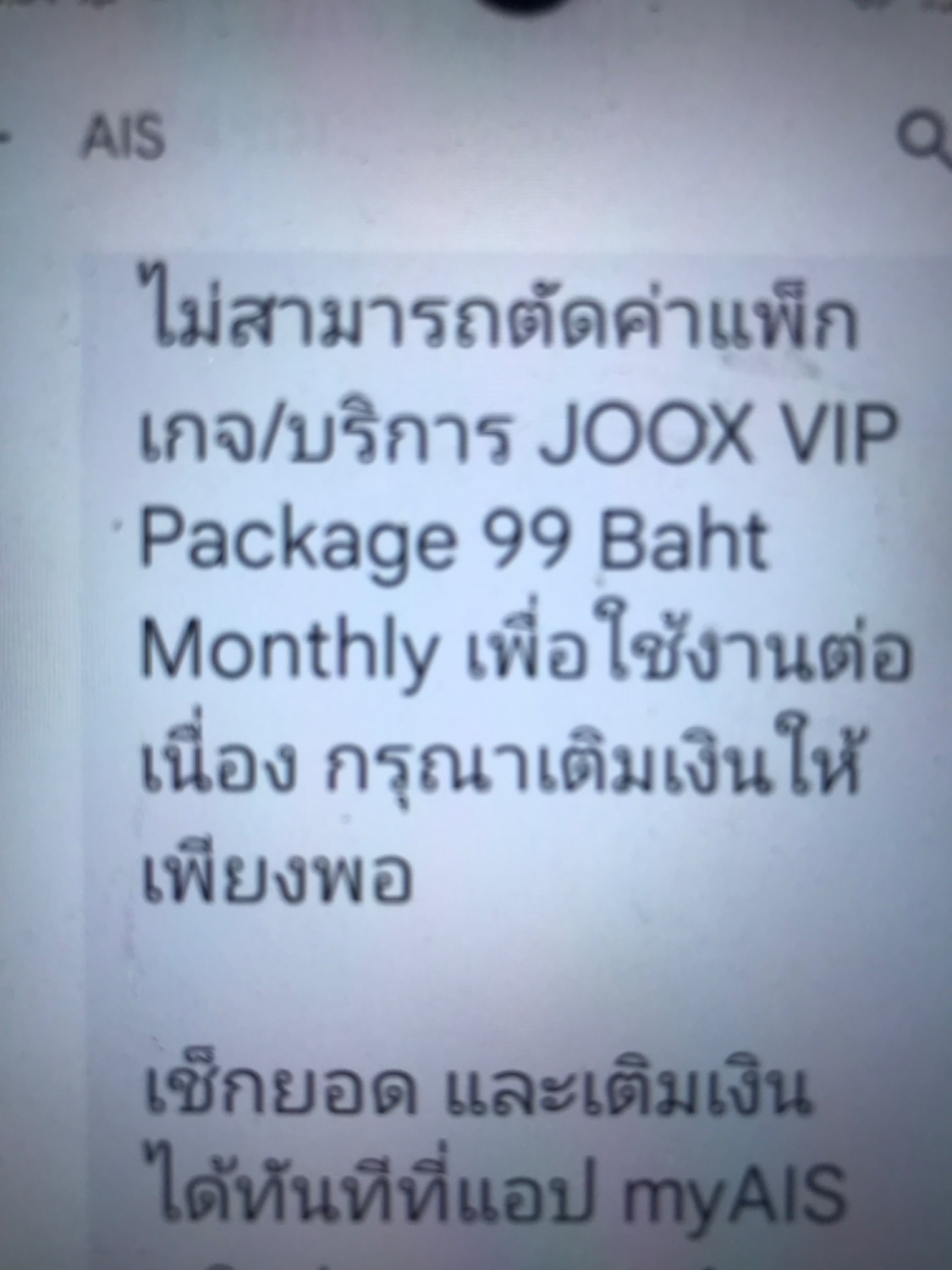 ตัดค่าบริการแพ็กเกจ เน็ตเต็มสปีด 3 GB + WiFi ไม่อั้น นาน 5 วัน (ต่ออายุอัตโนมัติ) 49 บาท ไม่สำเร็จ กรุณาเติมเงินเพื่อต่ออายุแพ็กเกจ และใช้บริการได้อย่างต่อเนื่อง หรือต้องการยืมเงินเพื่อใช้ต่อแพ็กเกจ ก