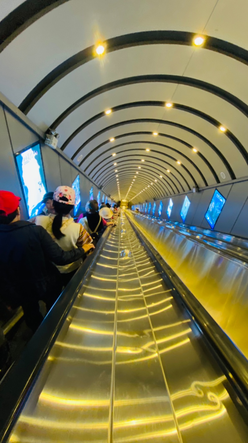 ระหว่างนั่งกระเช้าจะผ่านยอดเขา 2-3 ยอดเขา สามารถถ่ายรูปถนนโค้งที่ตัดผ่านขึ้นลงเขาแบบ top view พอลงจากกระเช้าต้องลงบันไดเลื่อนไปอีก 4 ระดับ