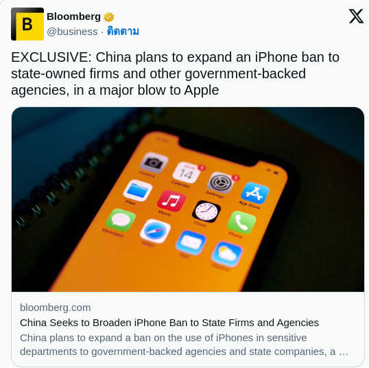 รัฐบาลปักกิ่งยืนยัน "ไม่มีนโยบาย" ห้ามเจ้าหน้าที่รัฐและประชาชนทั่วไป ใช้สมาร์ตโฟนของต่างประเทศ รวมถึง ไอโฟน แต่ย้ำว่า บริษัทต่างชาติทุกแห่ง "ต้องทำตามกฎหมายของจีน"