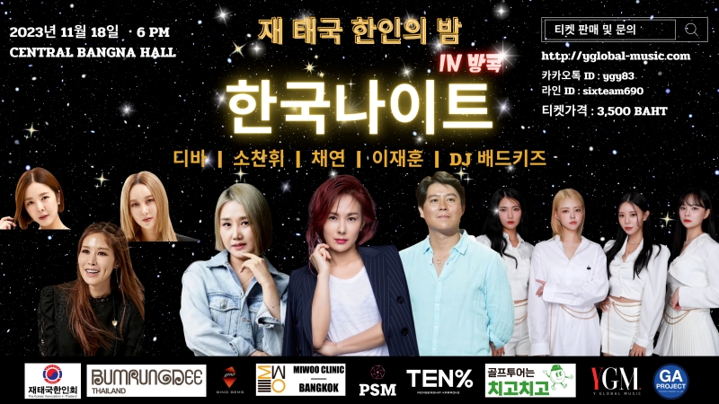 Korean Night in Bangkok ในวันเสาร์ที่ 18 พฤศจิกายน 2566 ณ เซ็นทรัลบางนา ฮอลล์, ห้างสรรพสินค้าเซ็นทรัลบางนา กันได้เลย งานนี้ YGLOBAL MUSIC และ PSM ผู้จัดงานจะพาทุกคนเข้าสู่ปาร์ตี้ความสนุกกับขบวนศิลปินชื่อดังในยุค 90 ไม่ว่าจะเป็น