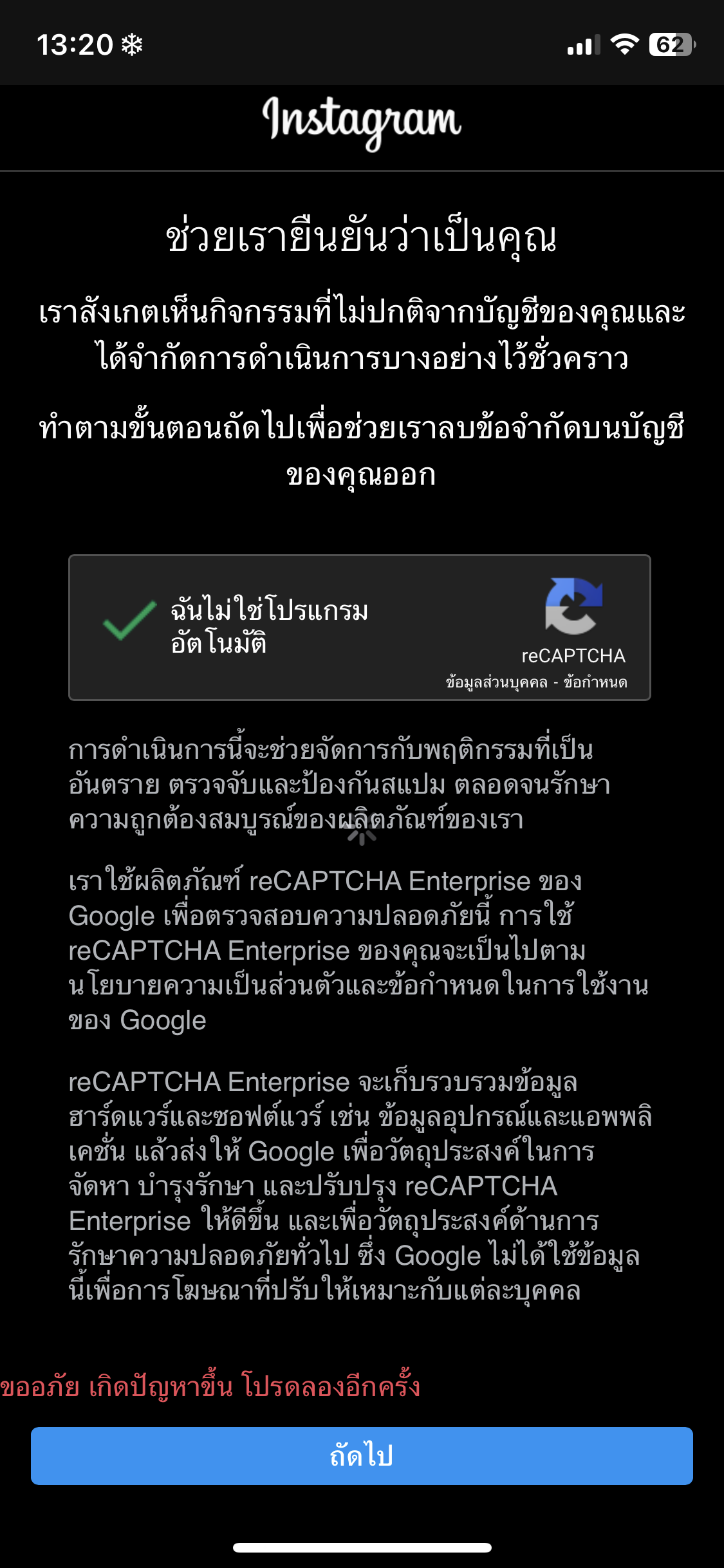 ช่วยด้วยครับด่วนๆเข้าไอจีไม่ได้ ขึ้นแบบนี้ แล้วก้ กดถัดไปกดไม่ได้ครับ ทำอะไรไม่ได้เลย