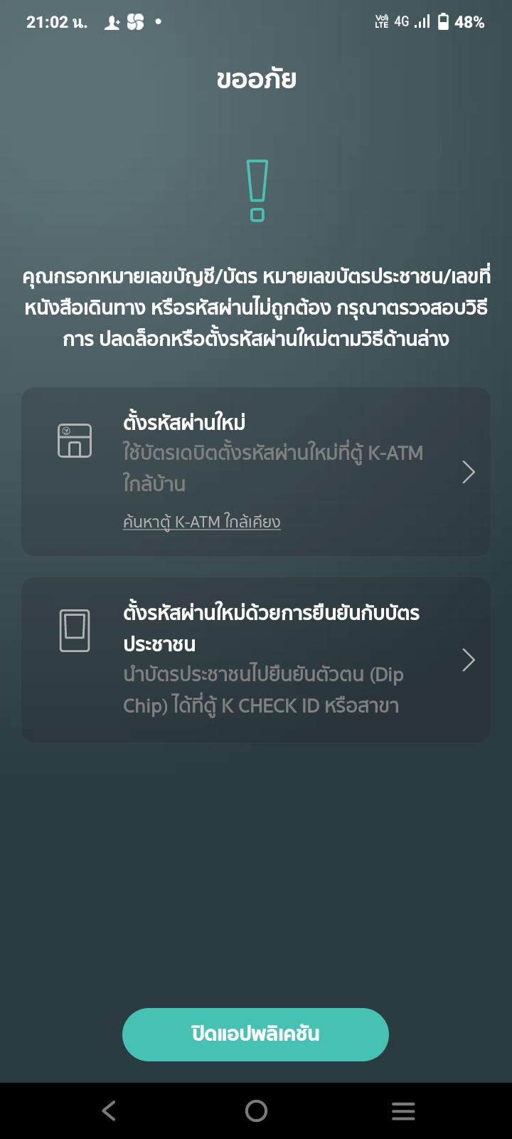 คือเราต้องกาลบบัญชีออกจากเคพลัสค่ะแล้วเรามี2บัญชีคือ มีสมุดคู่ฝากและไม่มี ค่ะแล้วแอปให้ใส่รหัสแล้วดันใส่ผิดแอพให้ให้เรากด ยืนยันอีกครั้ง แต่ App ได้ขึ้นว่า เราใส่ เลขบัตรประชาชนผิดหรือเลขบัญชีผิด ทางท