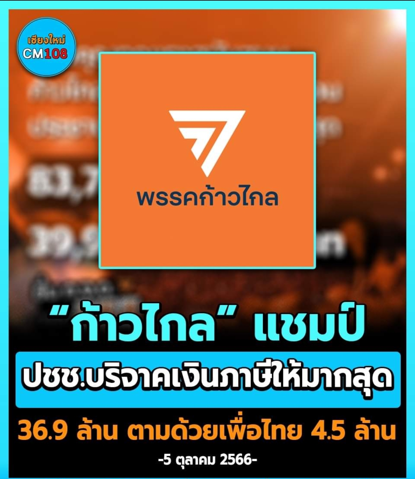 “ก้าวไกล” แชมป์พรรคการเมือง ที่ประชาชนบริจาคเงินภาษีให้มากสุด 83,733 ราย เป็นเงินกว่า 36.9 ล้านบาท