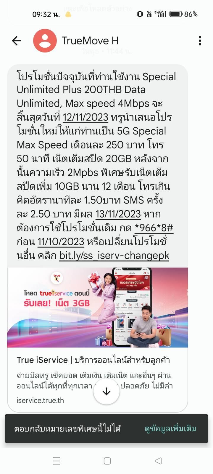 อยากจะสอบถามว่าผมก็ใช้บริการเน็ตโทรศัพท์ทรูมานานแล้ว แต่ที่ทางทรูส่ง SMS มาว่าโปรรายเดือนจะสิ้นสุดตามวันในรูปนี่คือถ้าถึงวันที่ 12/11/2023 เนี่ยเขาจะตัดเน็ตของผมออกไปเลยใช่ไหมครับ เพราะผมกด *966*8# ไปแล้วว่าจะใช้โปรเดิมครับ