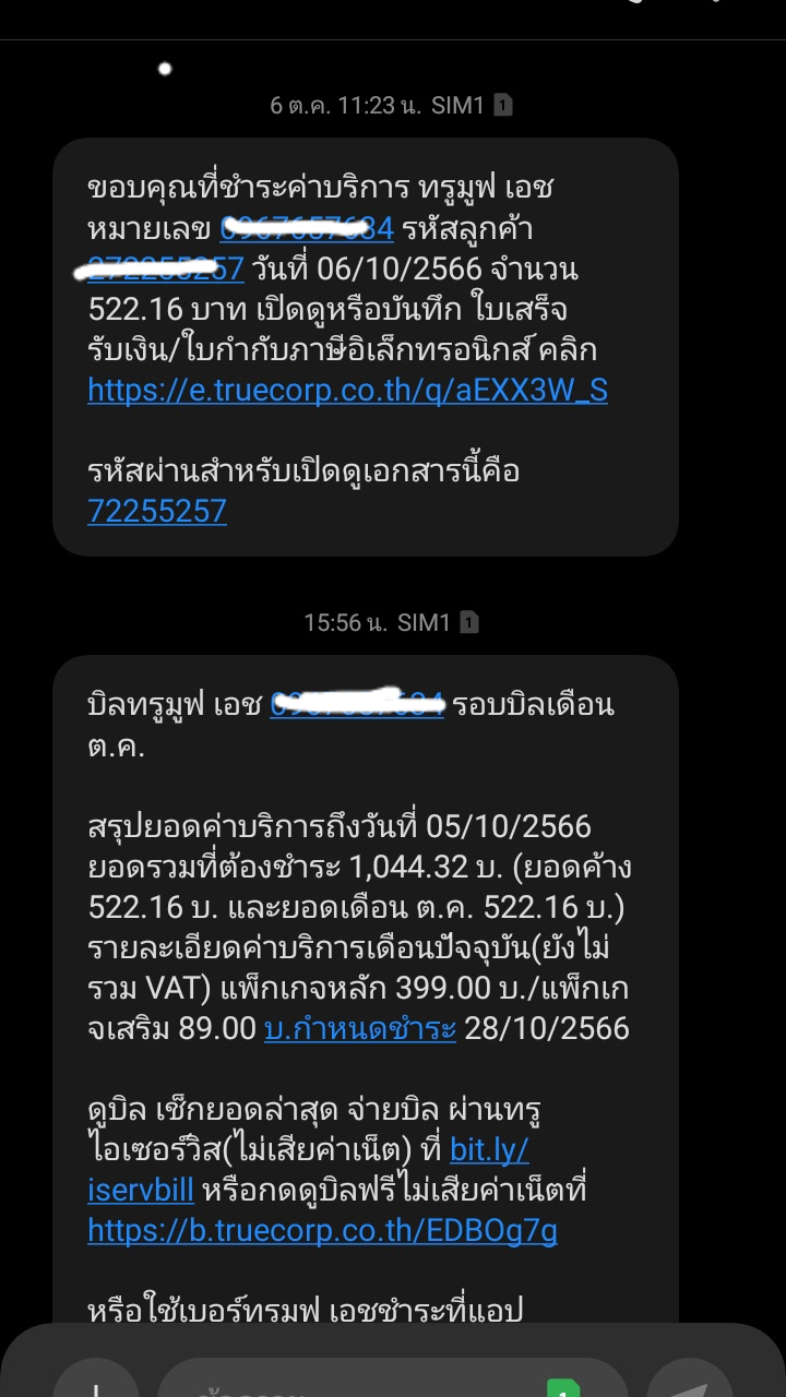 เป็นเบอร์เติมเงินที่เอาไว้ใช้ติดต่องานกับลูกค้าค่ะ เมื่อวานมีข้อความจาก IService เข้ามา " ขอบคุณที่ชำระค่าบริการ 2545.1 บาท สำหรับ True Online " แล้วก็เป็นลิงค์หมายเลข 10 หลัก ต่อด้วยประโยค
