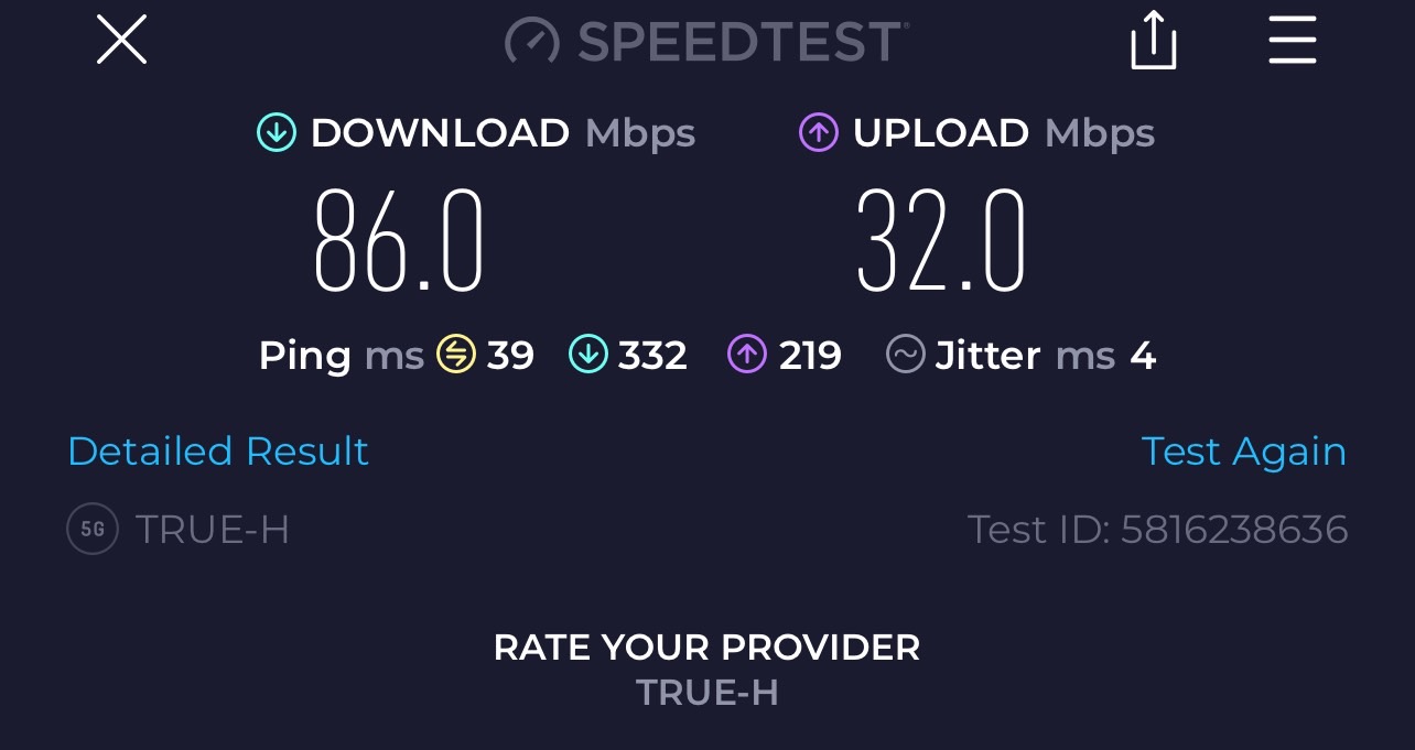 ช่วงนี้สัญญาณอินเตอร์เน็ตทรูมีปัญหาหรือเปล่า ใช้งานได้บ้างไม่ได้บ้าง เข้าแอป True iService ก็ไม่ได้ จะแจ้งปัญหาก็ต้องรอเจ้าหน้าที่นานมาก กว่าจะว่างทดสอบ speed การใช้งานแล้วก็ได้ผลตามรูป นี่ใช้งาน 5g อยู่นะคะ แต่ได้แค่นี้เอง เศร้าค่ะ