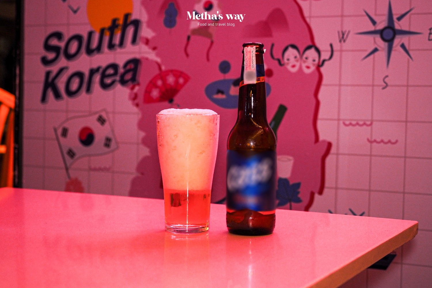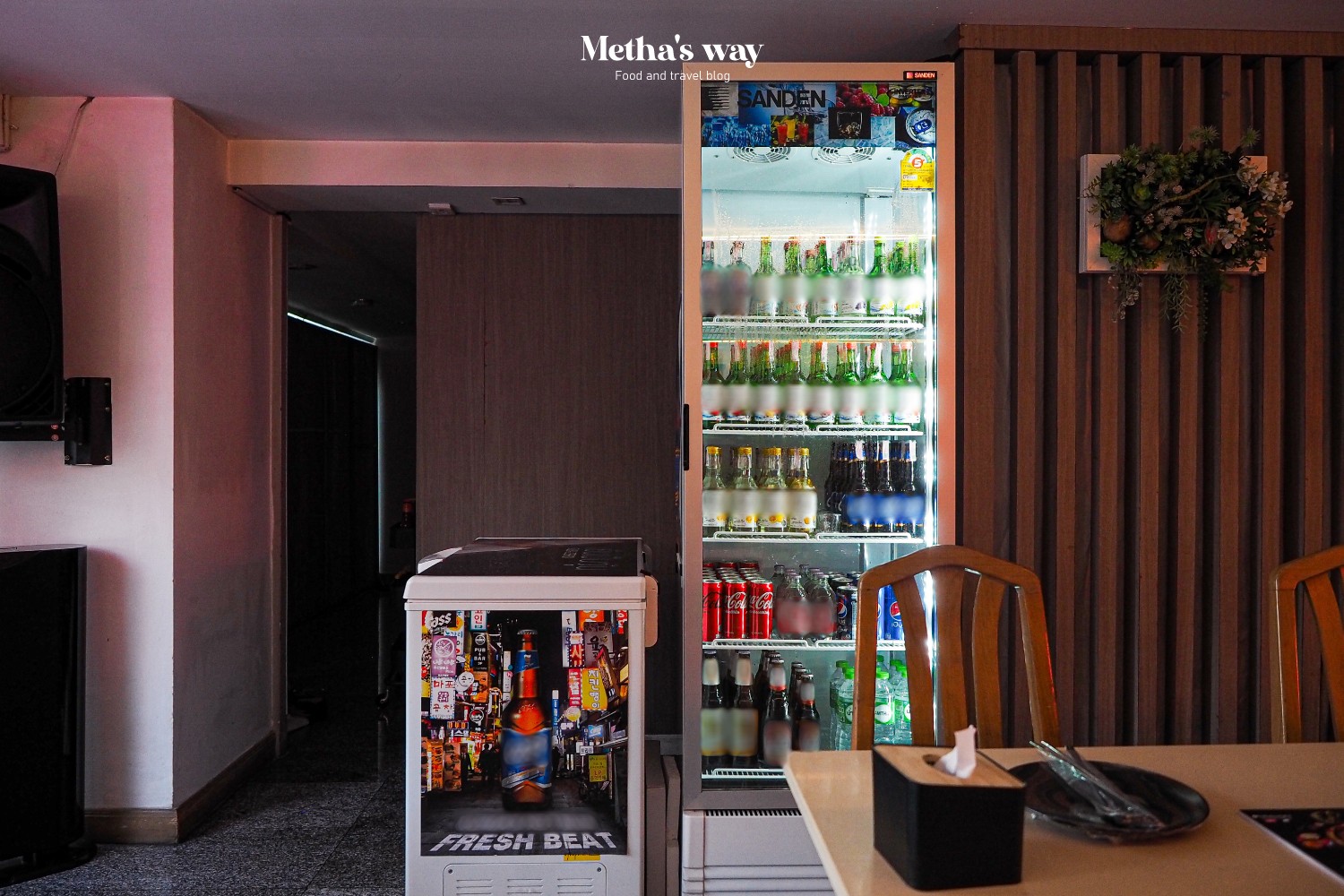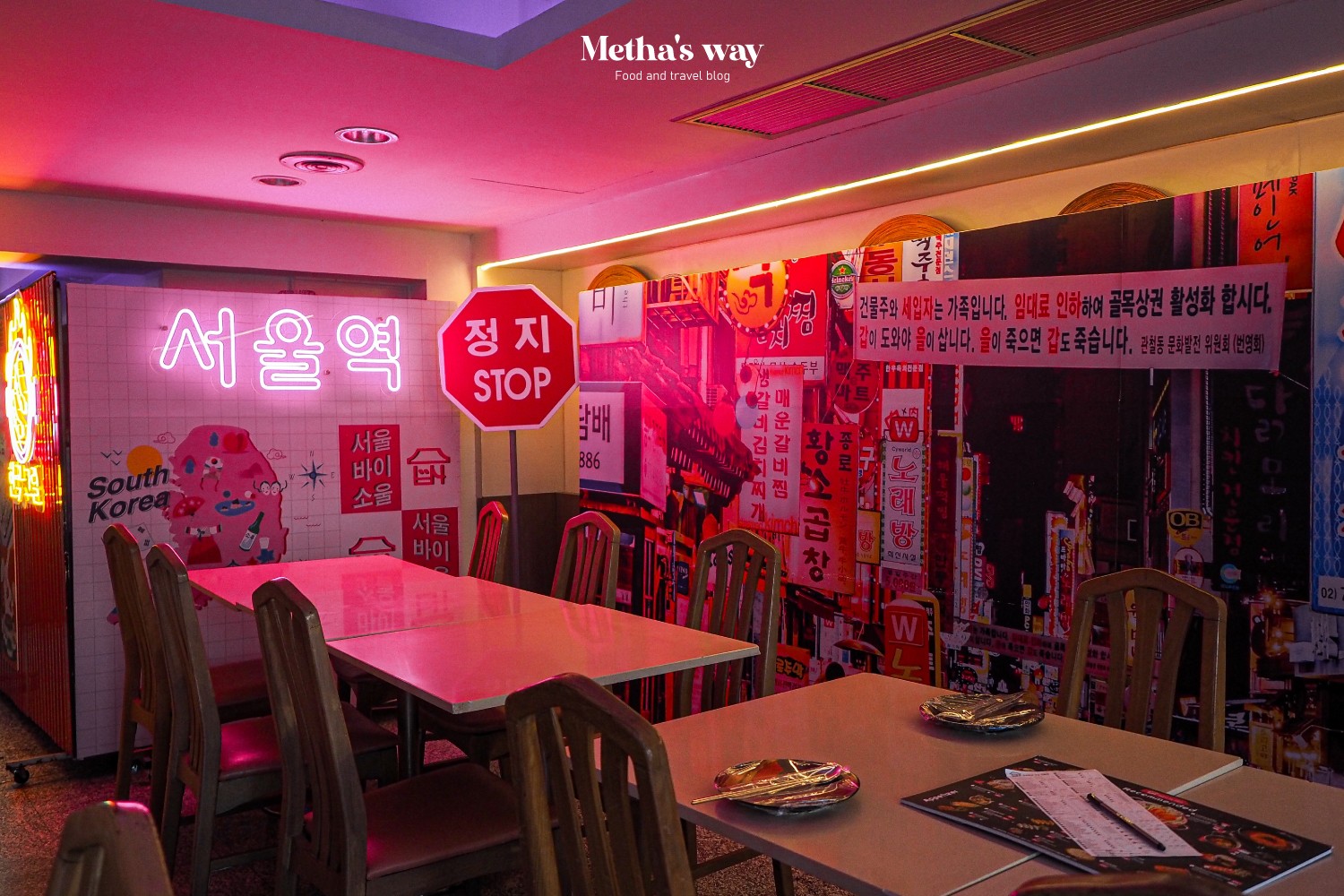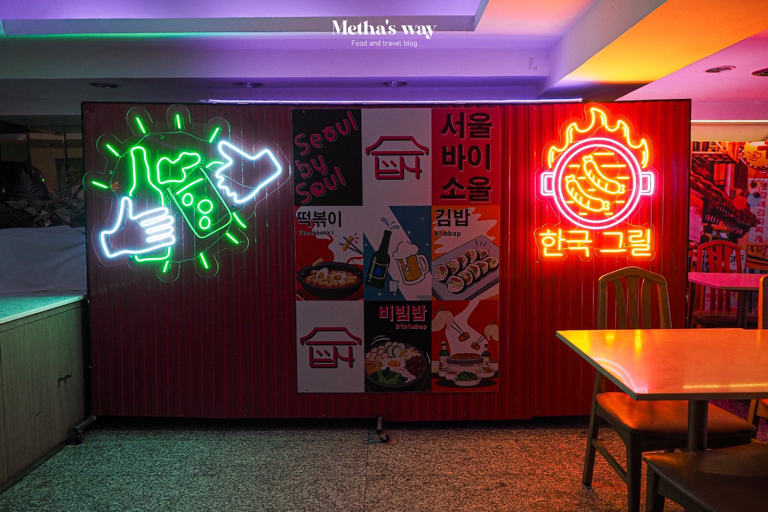 ด้านในร้านตกแต่งด้วยกำแพงที่มีภาพโปสเตอร์แนวเกาหลี และไฟนีออนหลากสีรอบร้าน ใครมาทานตอนกลางคืนไฟจะสวยมาก~ มีมุมให้พอได้ถ่ายรูปแบบกรุบกริบ