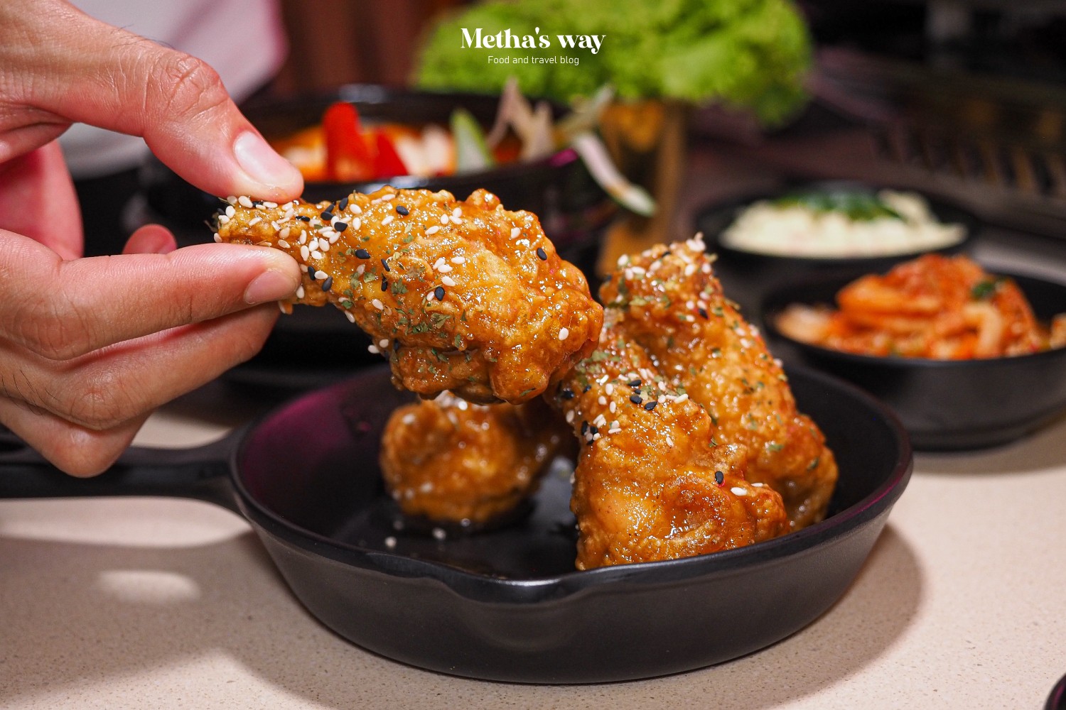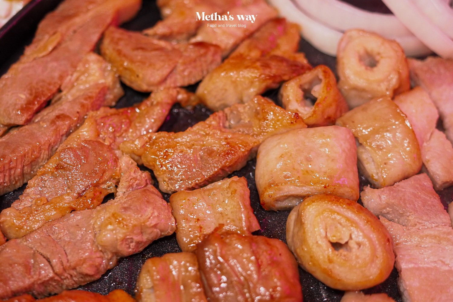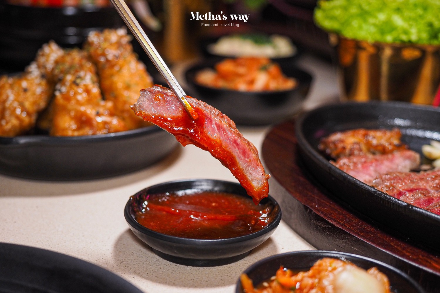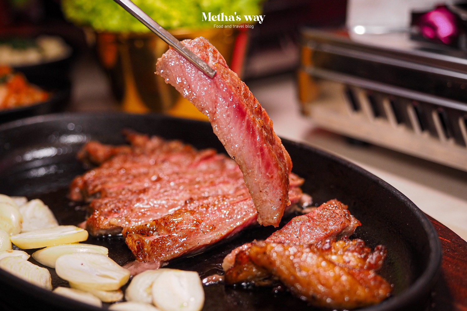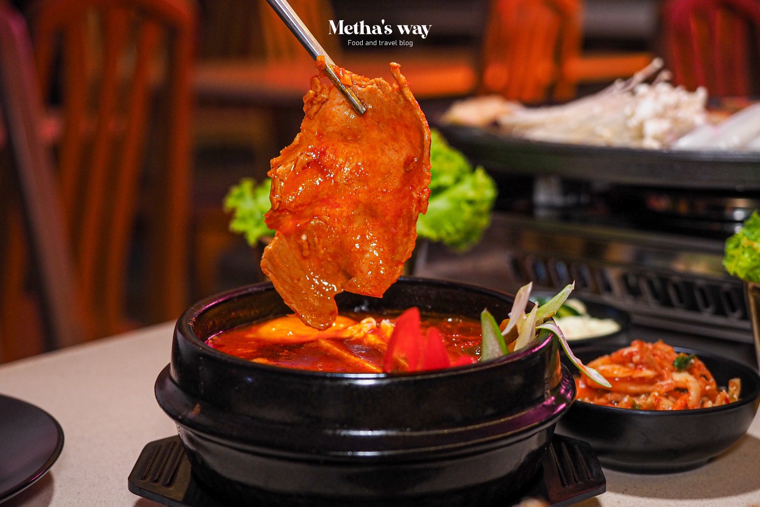 เสิร์ฟมาแบบกระทะร้อนพร้อมกิมจิ ซอสซัมจัง และผัก เนื้อย่างมาแบบฉ่ำๆ พอทิ้งไว้สักพักจะได้ความสุกแบบพอดี กินตอนร้อนๆ ก็อร่อย แต่ทิ้งไว้นานเนื้อก็ยังคงความนุ่ม ฉ่ำไม่เปลี่ยน
