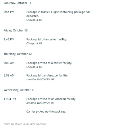 ระหว่างรอของ ก็เข้าไปดู Youtube ว่า Amazon Delivery ใน Warehouse หน้าตาเป็นอย่างไร คน หุ่นยนต์ทำงานอย่างไร พอมี Status ในระบบ Track ขึ้นมาว่าของตอนนี้ อยู่ไหนแล้ว ก็ลองกด ๆ Google map ดู ถือว่าเป็นการเรียนภูมิศาสตร์ไปในตัว Wisconsin อยู่ตรงไหนของอเมริกาหนอ, Chicago อยู่ตรงไหนหนอ ห่างกันกี่กิโลหนอ