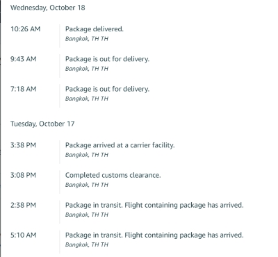 และแล้ววันที่ 17 เพียงแค่ 6 วันจากที่สั่ง Status ก็แสดงว่าของมาถึงประเทศปลายทางแล้วเมื่อเช้า ก็เตรียมใจต่อว่าให้เวลาเคลียร์เรื่องของเข้า เรื่องภาษีซัก 2-3 วันละกัน ถ้าเทียบกับการสั่งของจาก Shopping Online ไทย ที่สินค้าส่งมาจากเมืองจีน ส่วนใหญ่ก็จะอยู่ขั้นตอนนี้ประมาณ 2-3 วัน