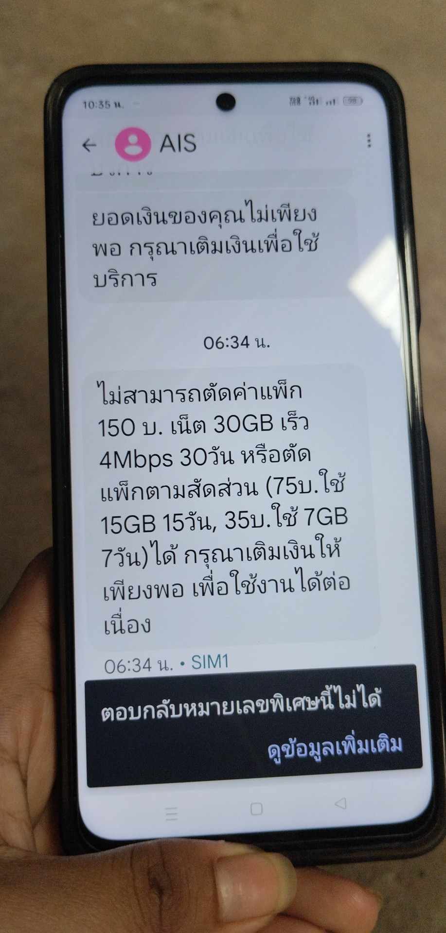 สมัครเน็ต AIS 150 บาท 30 วันตามนี้ ใช้เน็ตไม่ถึง 5 วัน ขึ้นข้อความแบบนี้แล้วเล่นไม่ได้อีกเลยทำยังไงดีคะ