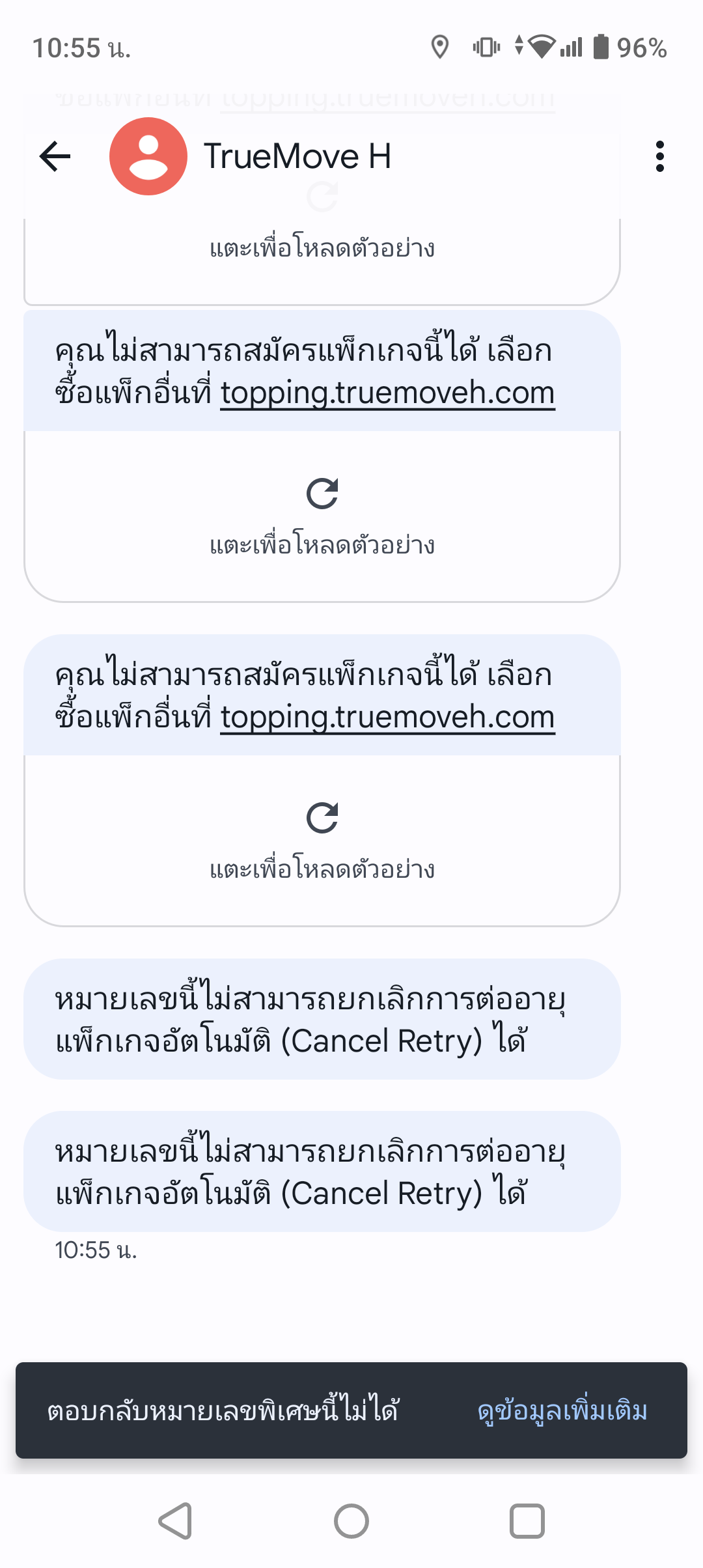 มี sms true แจ้งให้เติมเงิน 30 /9/68 แพคเกจ เน็ตไม่อั้น 4Mbps +Wifi+โทรฟรี ทุกเครือข่าย นาน 30 เมื่อเช้าเติมเงินเข้าไปแล้ว แต่ระบบไม่หักยอดเงิน ทำให้ใช้บริการแพคเกจนี้ไม่ได้ และช่วยยกเลิก บริการข้อคว