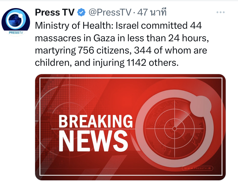 รัฐบาลอิสราเอลก่อเหตุสังหารหมู่ 44 ครั้งในฉนวนกาซาในเวลาไม่ถึง 24 ชั่วโมง ทำให้มีผู้เสียชีวิต 756 ราย ในจำนวนนี้เป็นเด็ก 344 ราย และบาดเจ็บอีก 1,142 ราย #กระทรวงสาธารณสุข