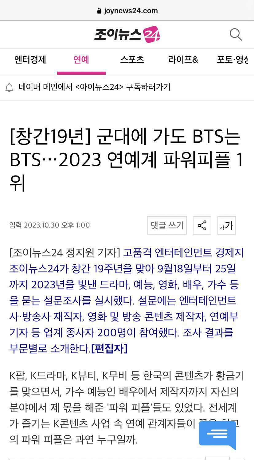 JoyNews24 สำรวจบุคคลที่ทรงอิทธิพลที่สุดในวงการบันเทิงเกาหลีปี 2023 โดยสอบถามผู้เชี่ยวชาญในอุตสาหกรรมบันเทิงเกาหลี 200 คน